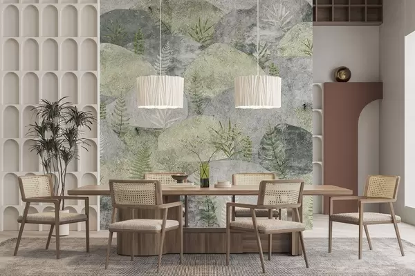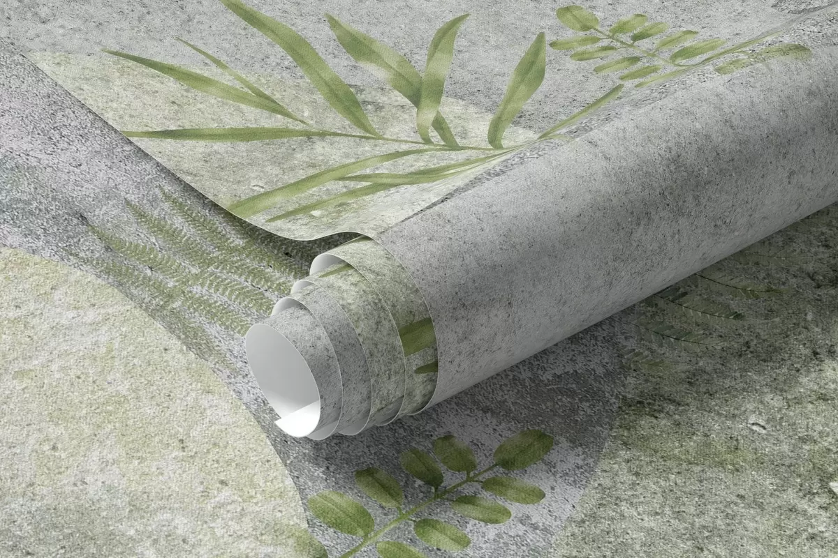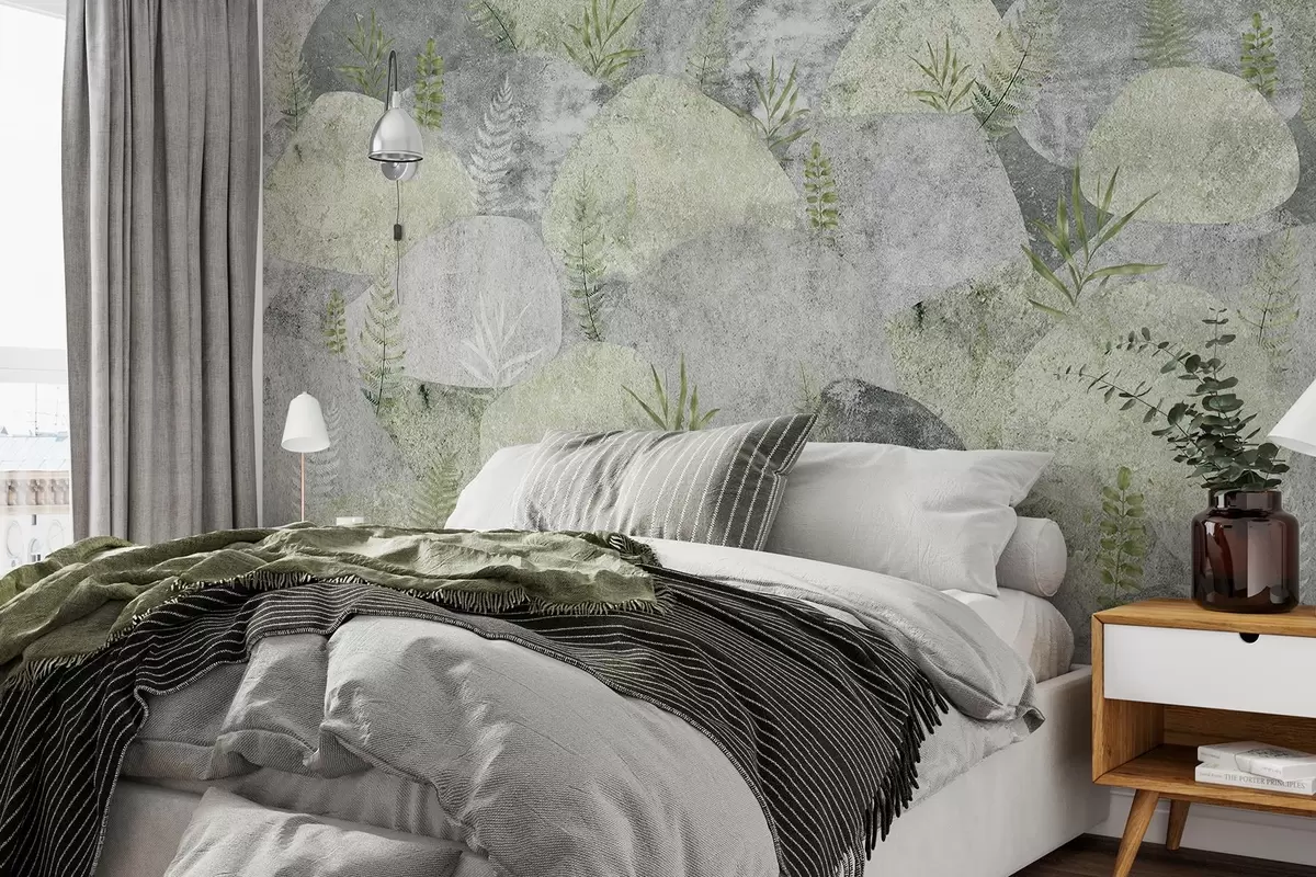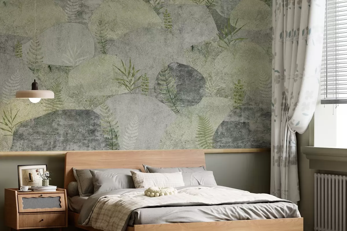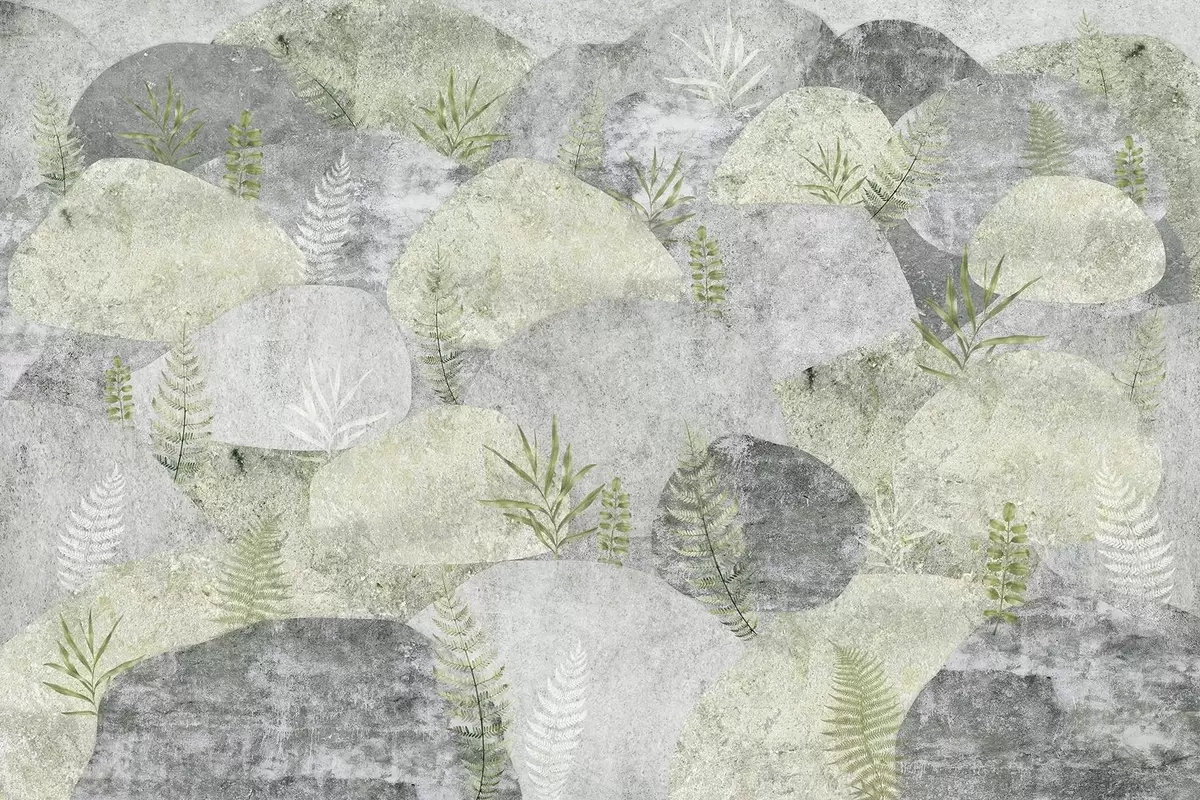 Fototapetes Akmeņi ar augiem, papardes, ziemeļu, lauku stilā, pelēkā un zaļā krāsā Nr. w04064v2