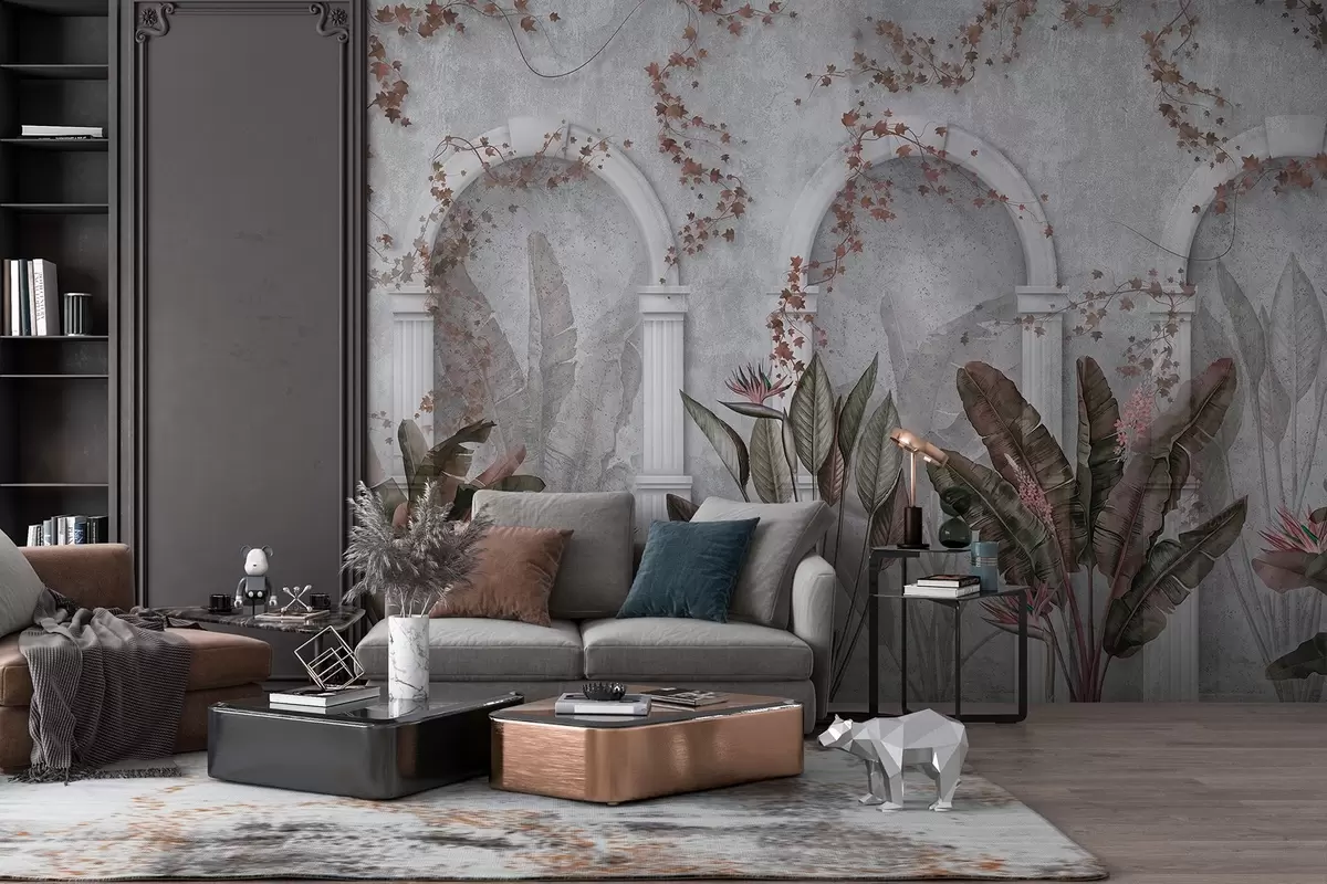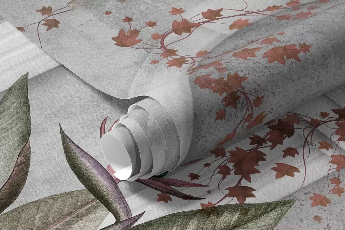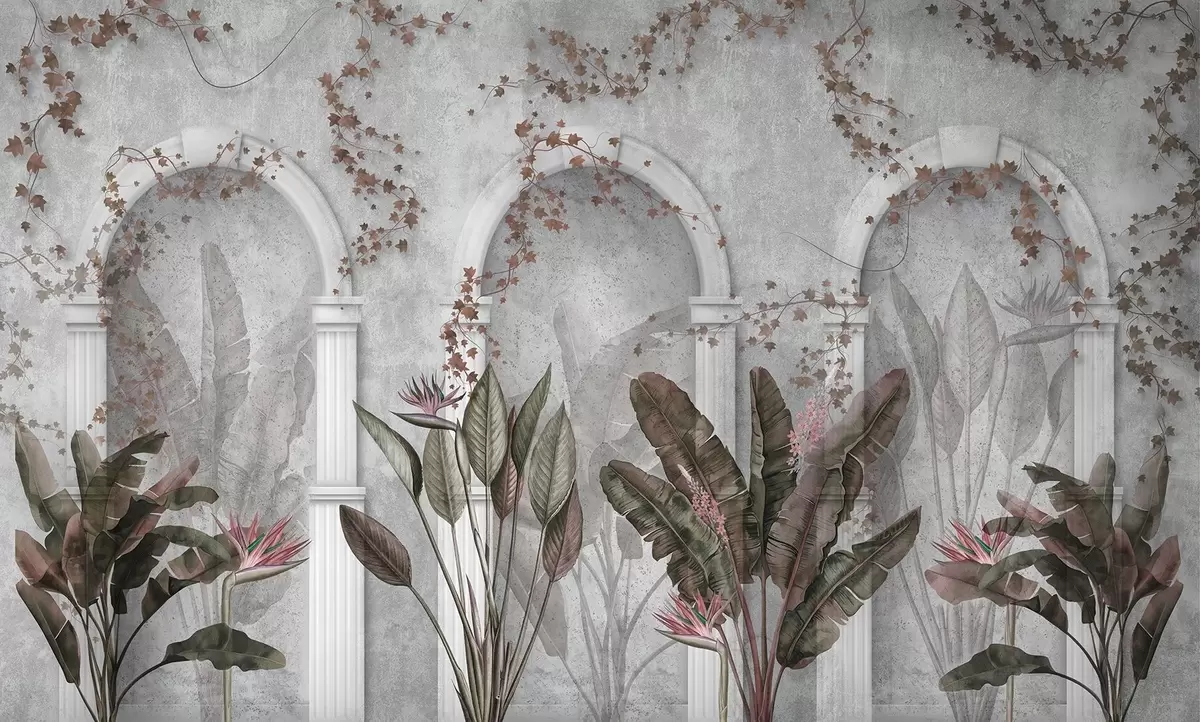 Fototapetes Betona siena ar arkām un tropu augiem, ziedu, bordo krāsas Nr. w04065v1