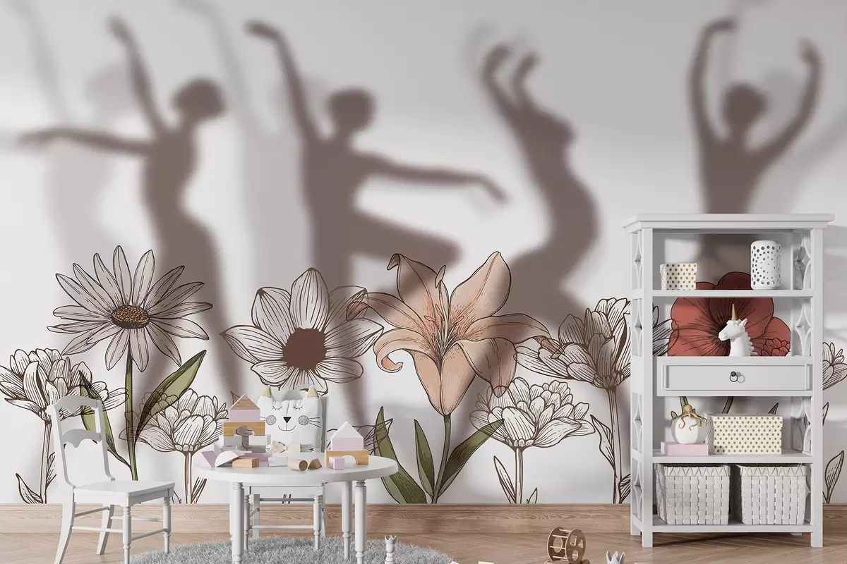 Fototapetes Balerīnu siluetes, lauku puķes, līniju māksla, sarkanas un bēšas krāsas w04069