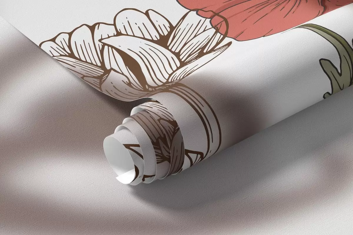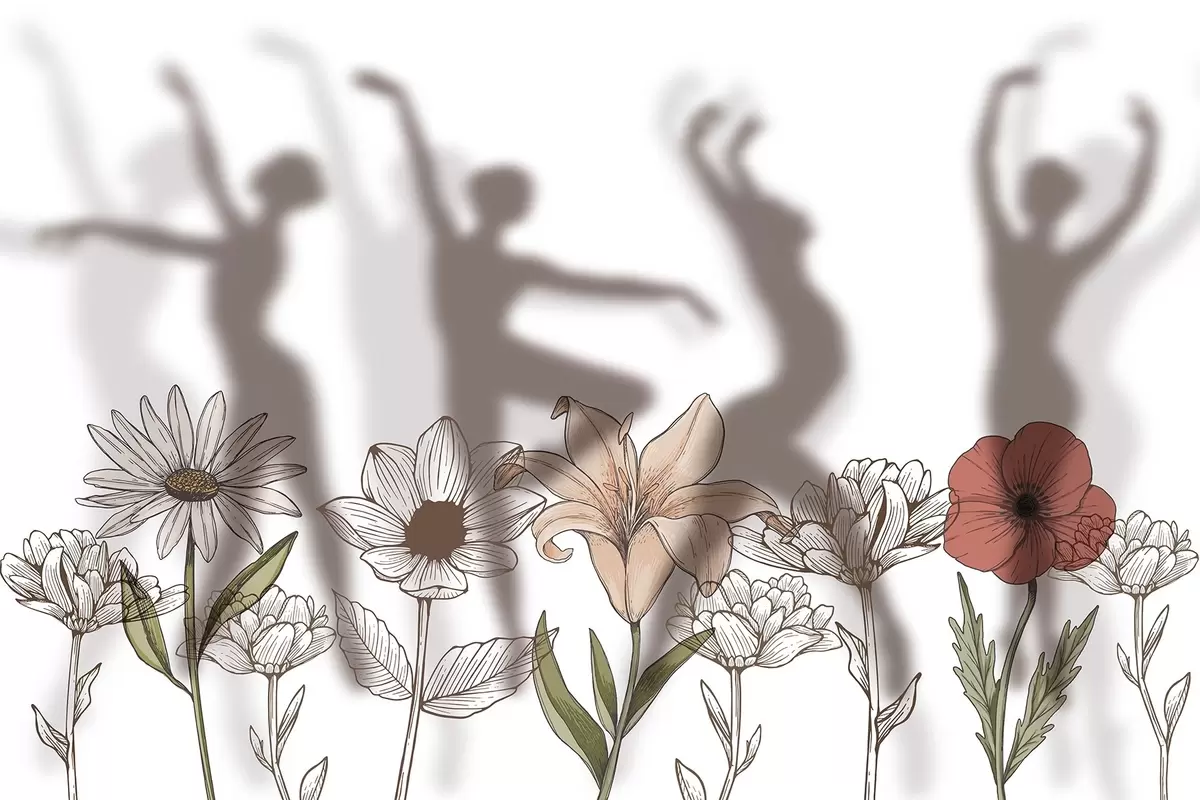 Fototapetes Balerīnu siluetes, lauku puķes, līniju māksla, sarkanas un bēšas krāsas Nr. w04069