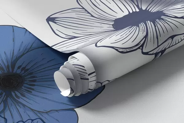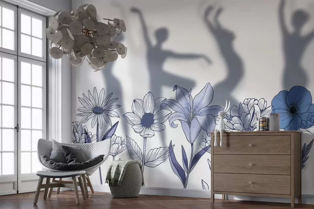 Fototapetes Balerīnas siluetes, lauku puķes, line art, zilas krāsas Nr. w04069v3