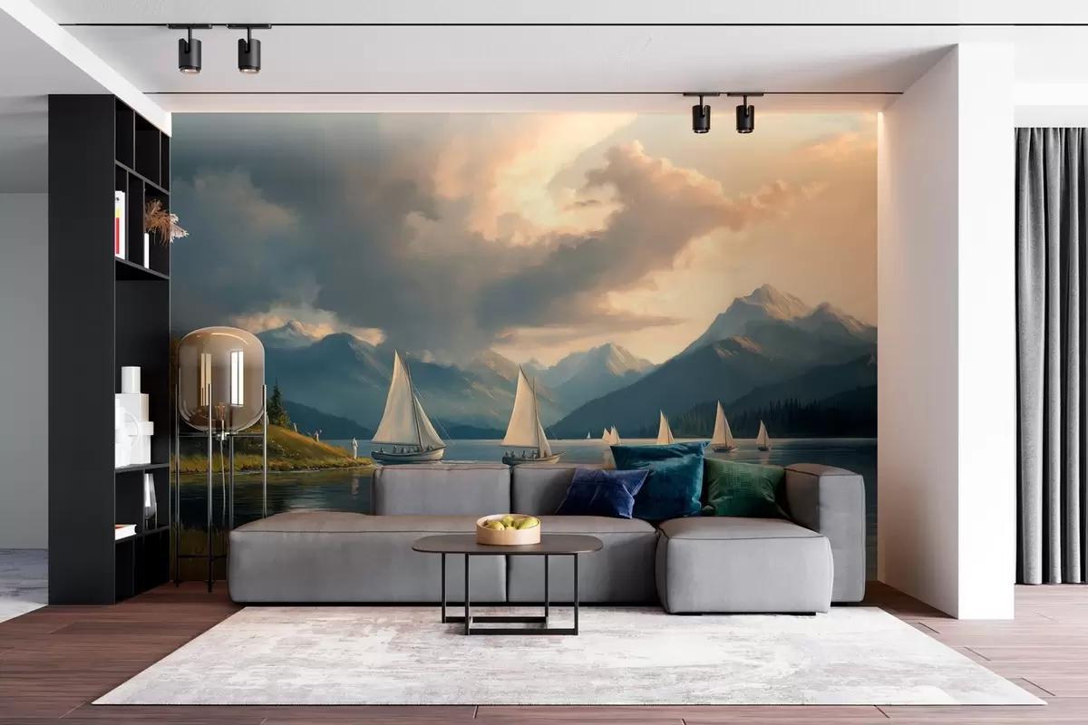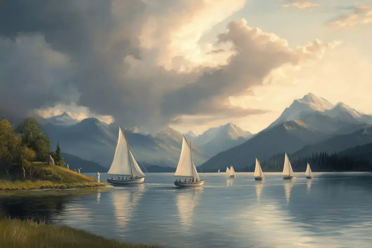 Fototapetes regate uz ezera ar mākoņainām debesīm 19. gadsimta eļļas gleznas stilā Nr. w04076