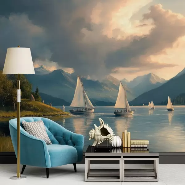 Fototapetes regate uz ezera ar mākoņainām debesīm 19. gadsimta eļļas gleznas stilā Nr. w04076
