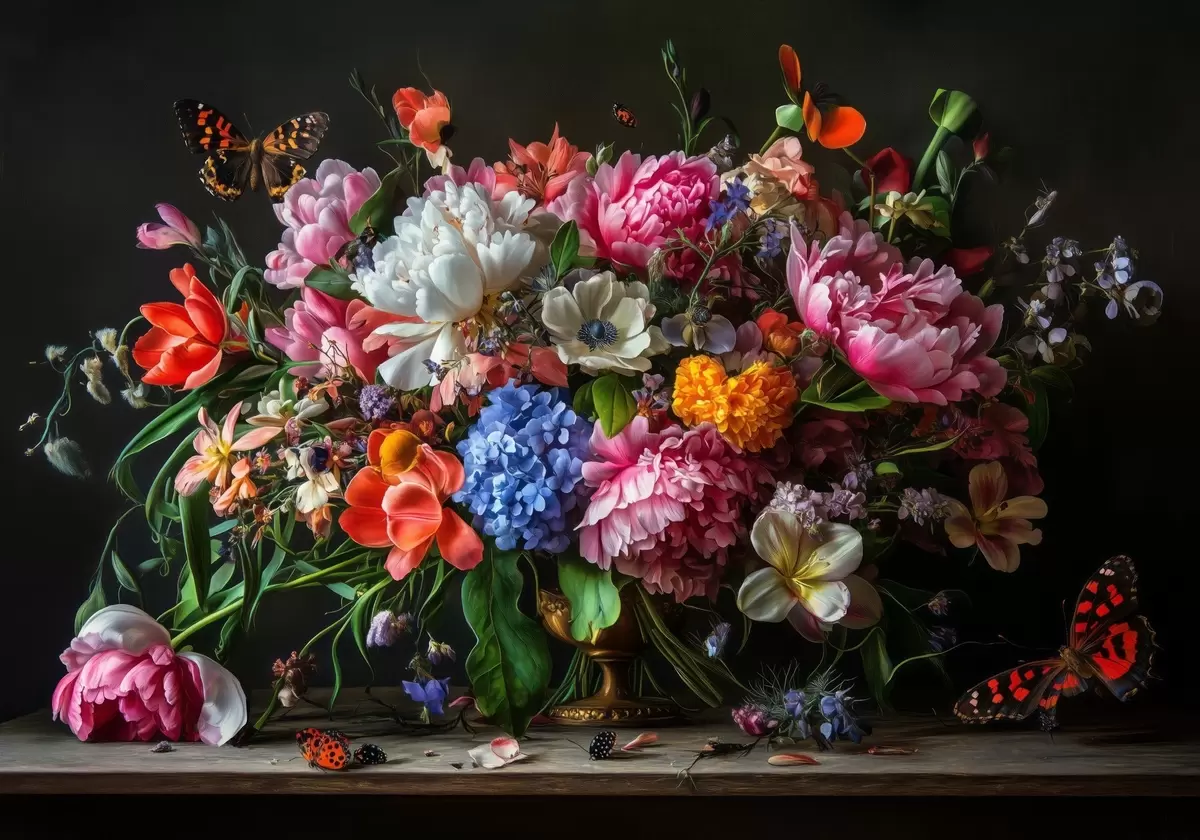 Fototapetes pušķis XVII gadsimta holandiešu eļļas glezniecības stilā ar greznu ziedu kompozīciju. Nr. w04078