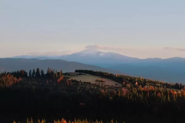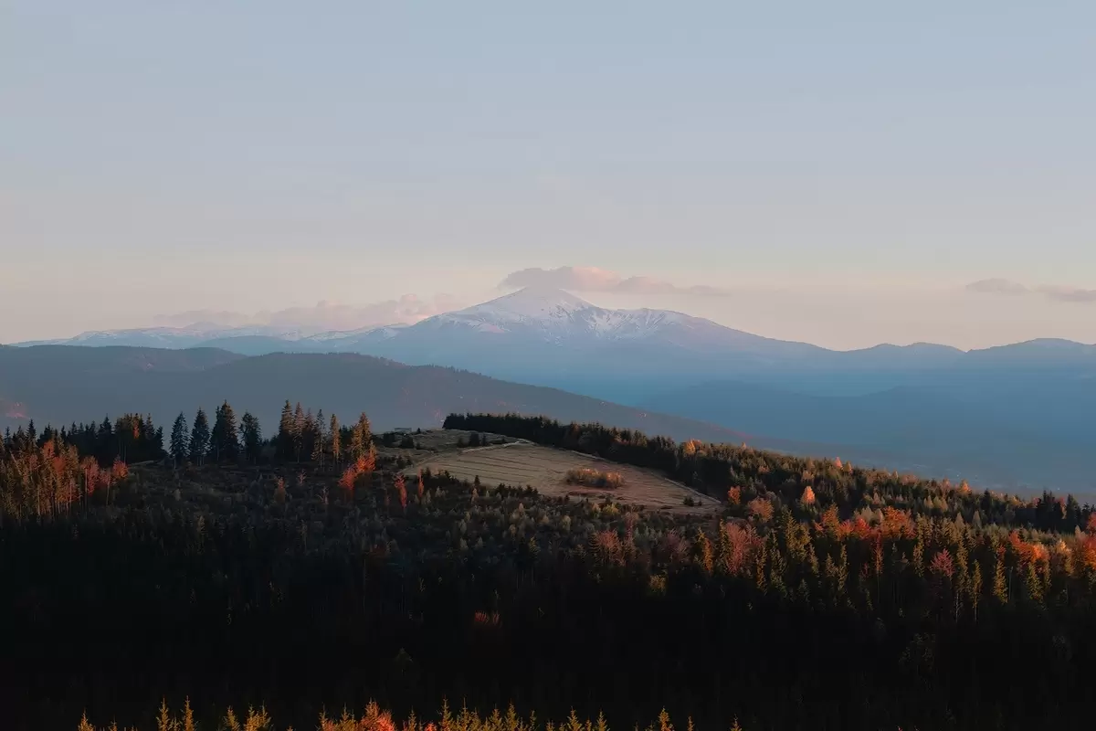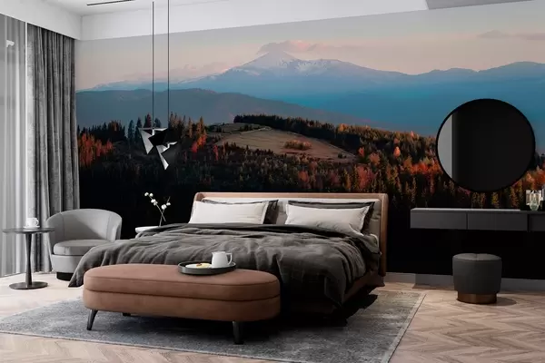 Fototapetes Karpatu kalni, eļļas stila tekstūra, rudens mežs, saulrieta debesis Nr. w04098