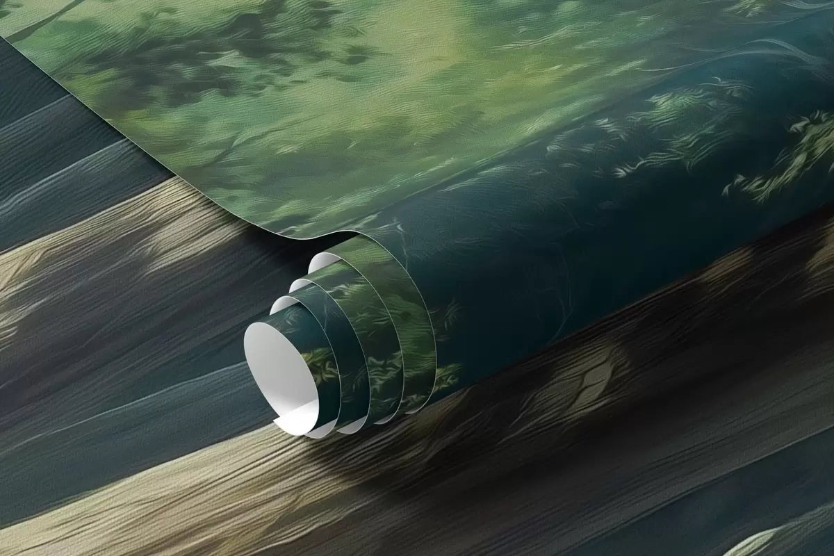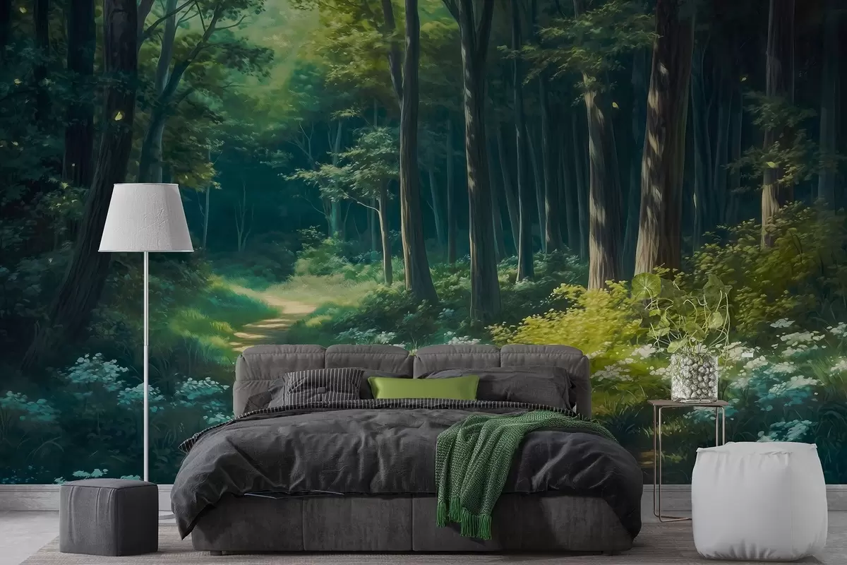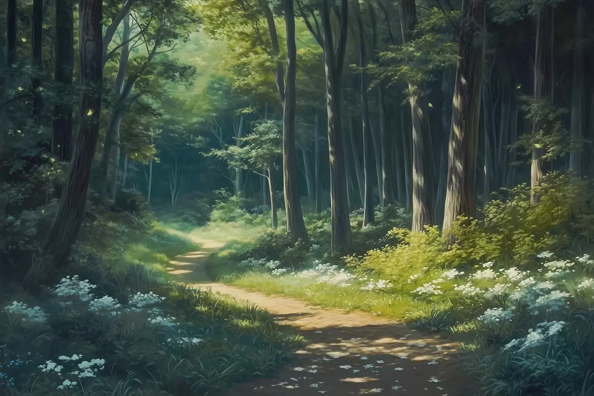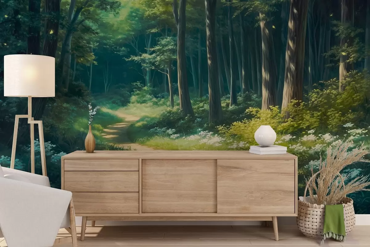 Fototapetes Zaļš mežs ar maigu saules gaismu, kokiem un baltiem ziediem, eļļas stila zīmējums Nr. w04118