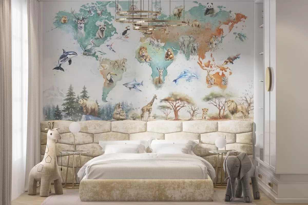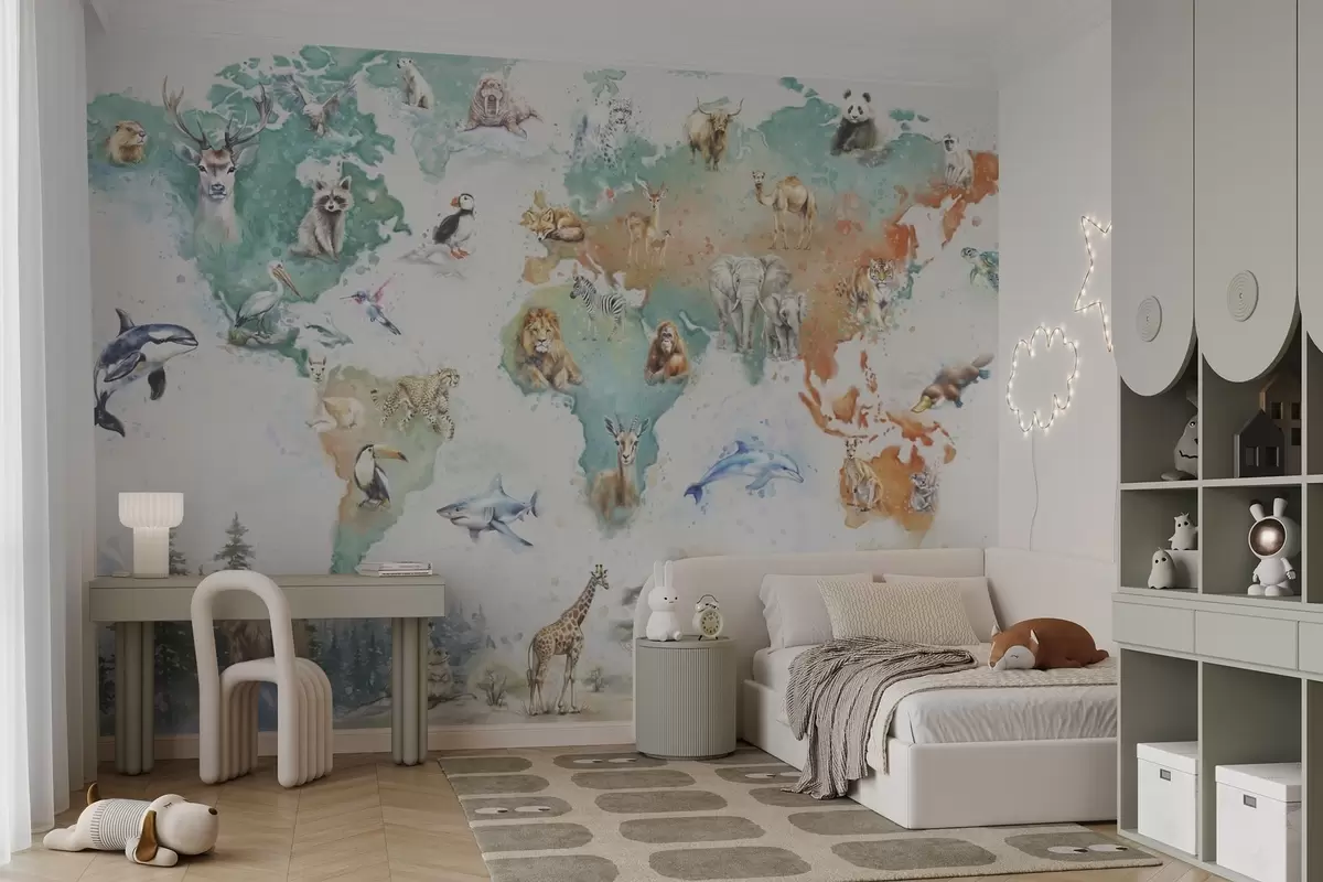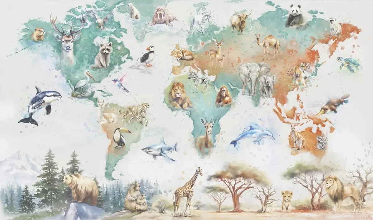 Fototapetes Pasaules karte ar dzīvniekiem, bērnu izglītojošā ilustrāciju stilā Nr. w04148