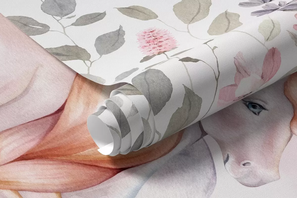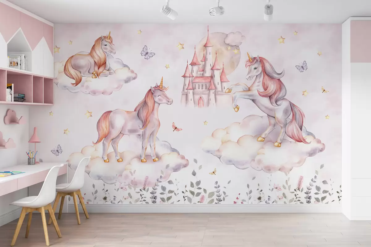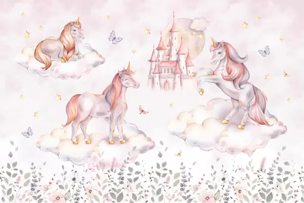 Fototapetes Vienradži mākoņos ar zvaigznēm, tauriņiem un ziediem Nr. w04165