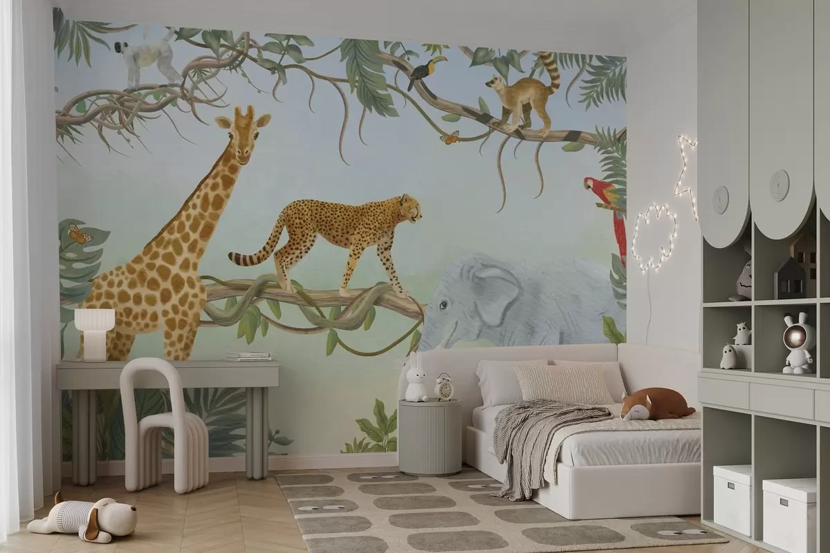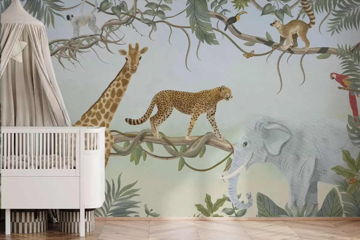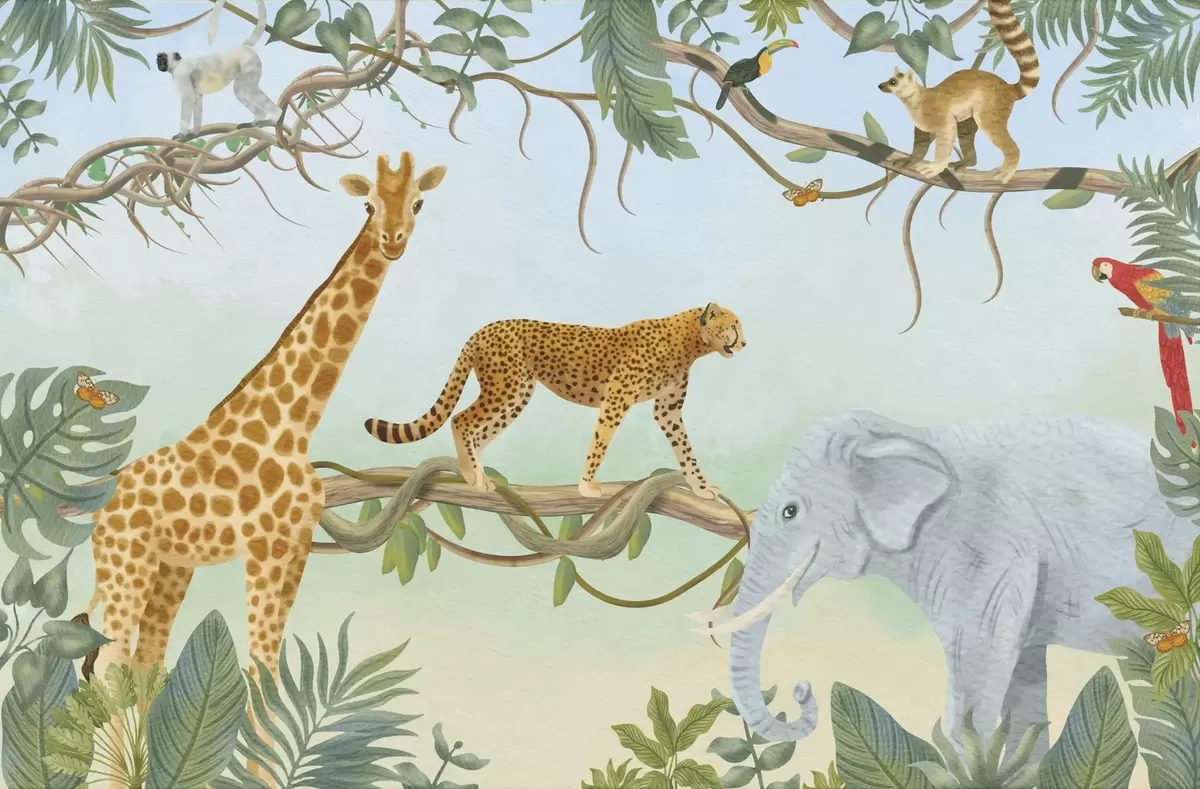 Fototapetes Džungļu ilustrācija ar žirafi, gepardu un ziloni Nr. w04194