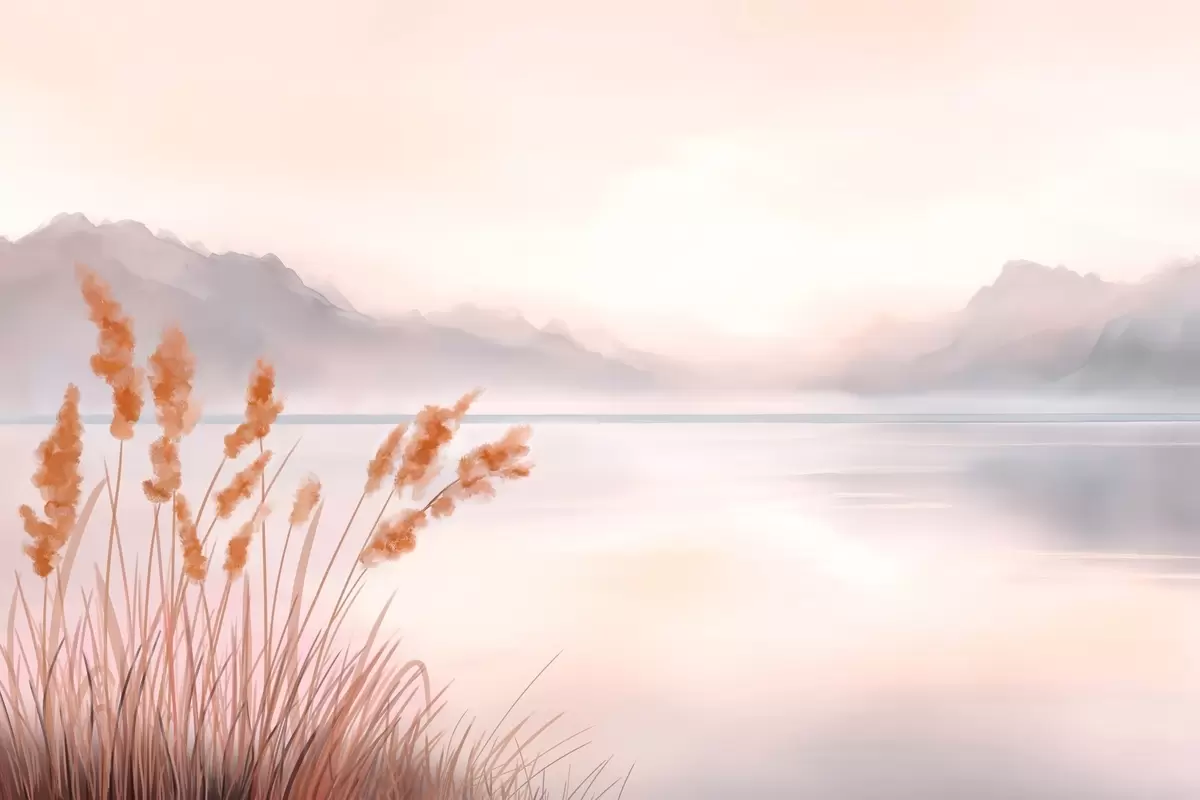 Fototapetes gleznains ezers ar niedrēm un kalniem Nr. w04315