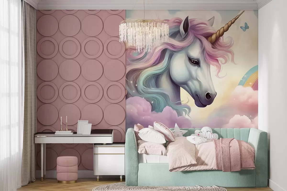 Fototapetes Vienradzis mākoņainās debesīs ar varavīksni Nr. w04372