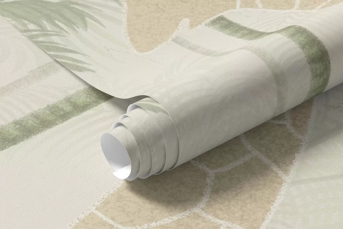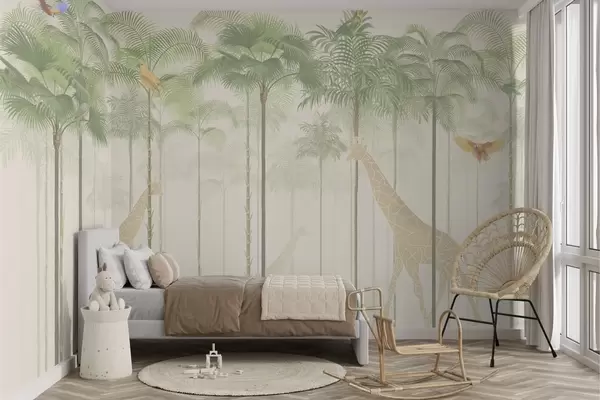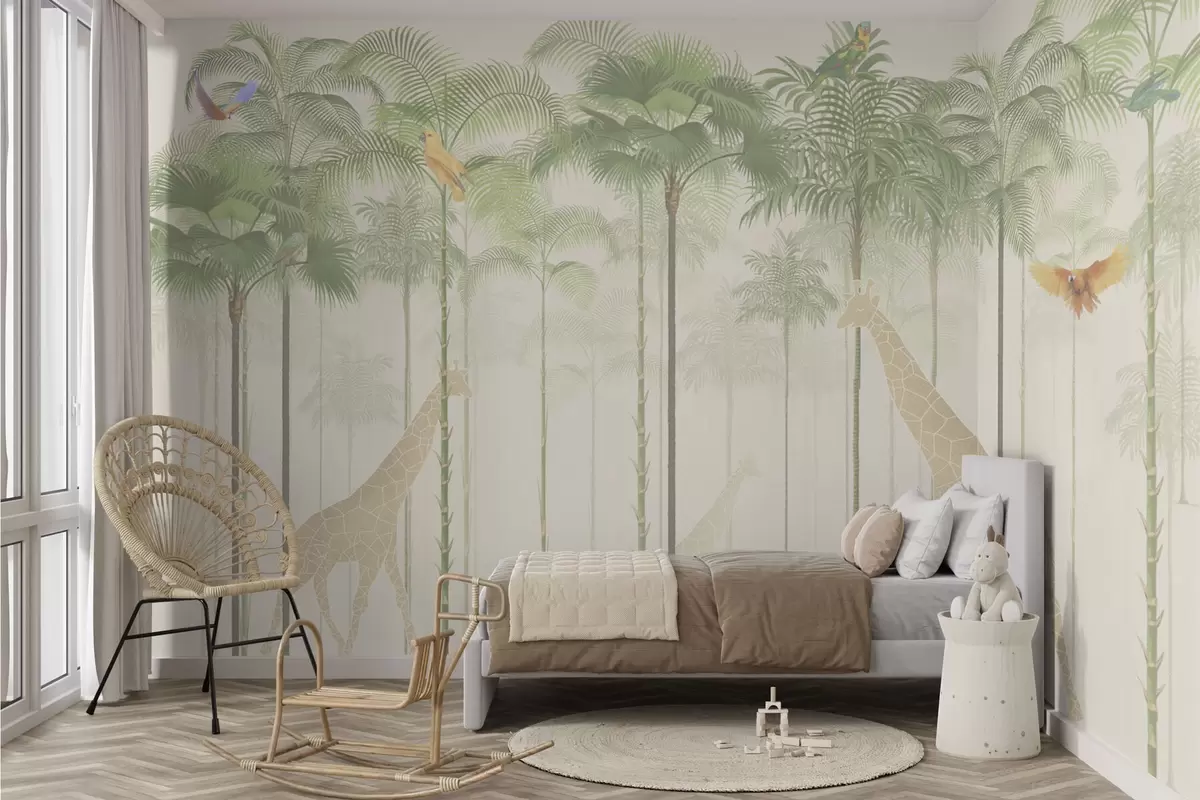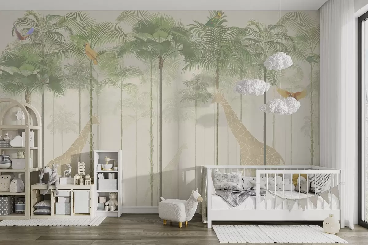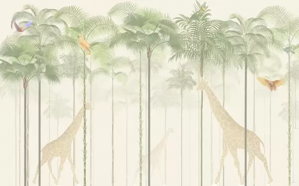 Fototapetes Žirafes un tropiskie putni starp augstām palmām Nr. w04400