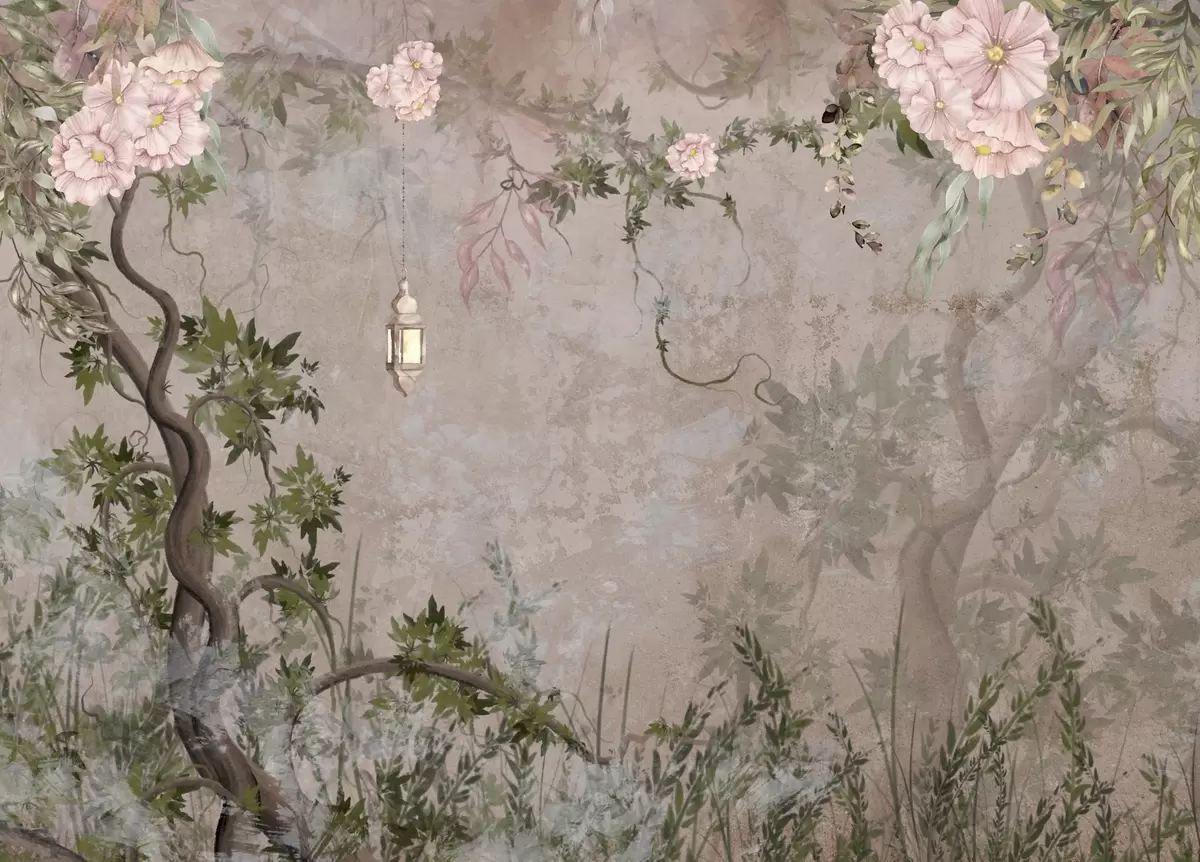 Fototapetes Pasaku dārzs ar ziediem, kokiem un laternu Nr. w04416
