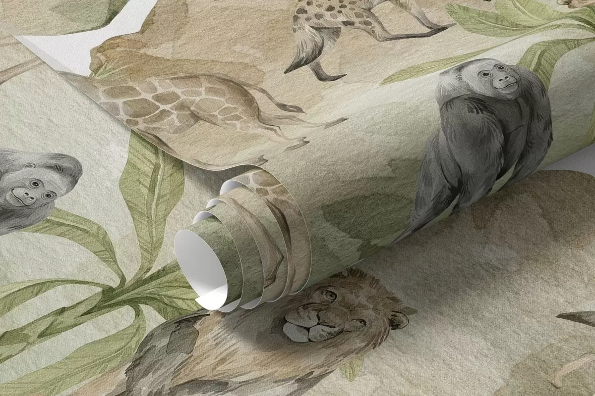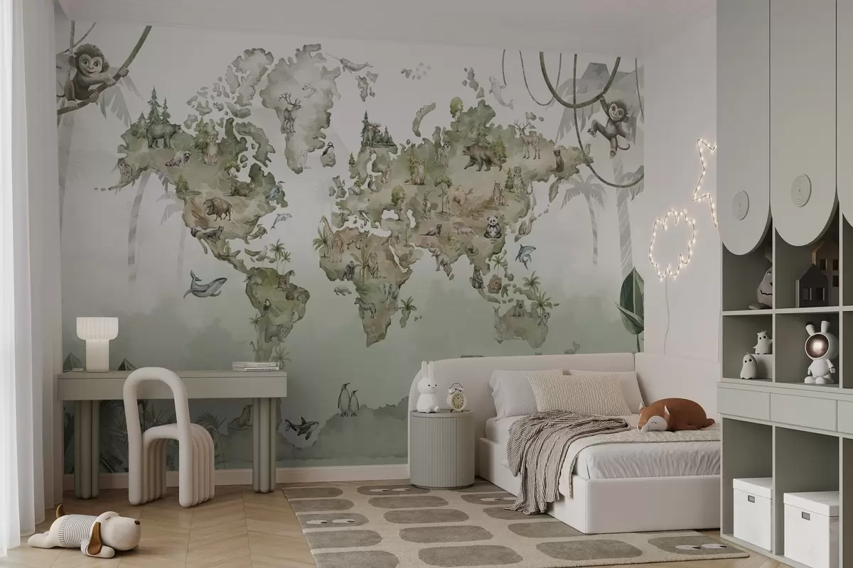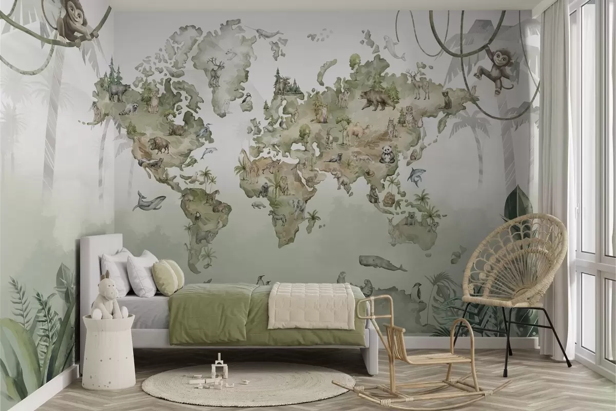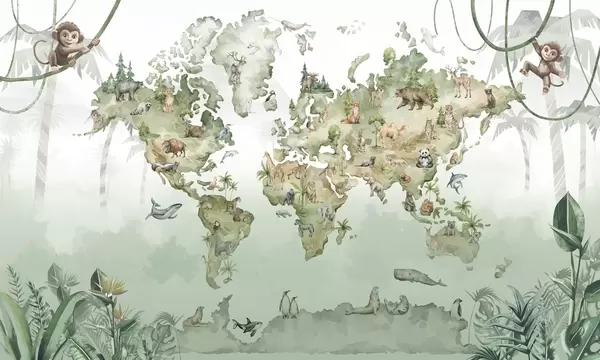 Fototapetes Ilustrēta pasaules karte ar dzīvniekiem un džungļiem Nr. w04418v1