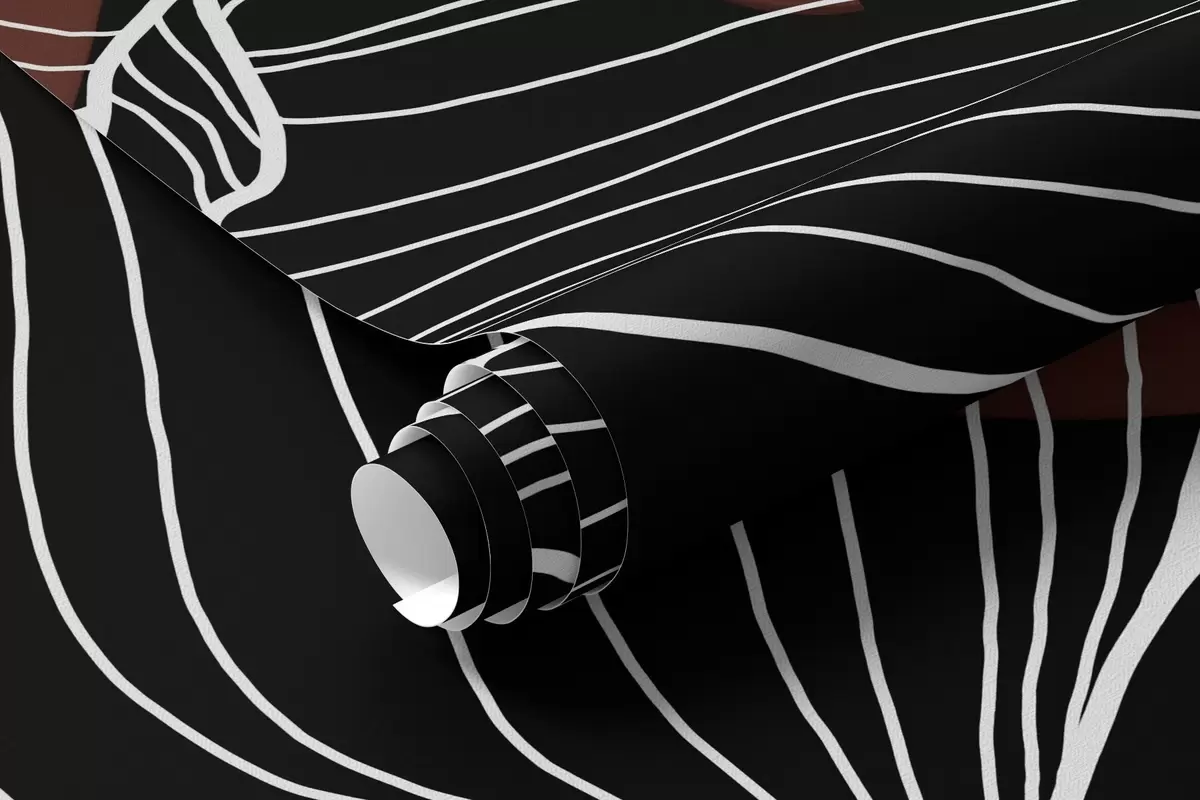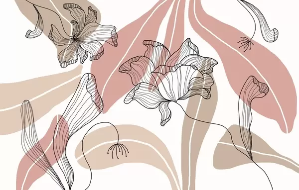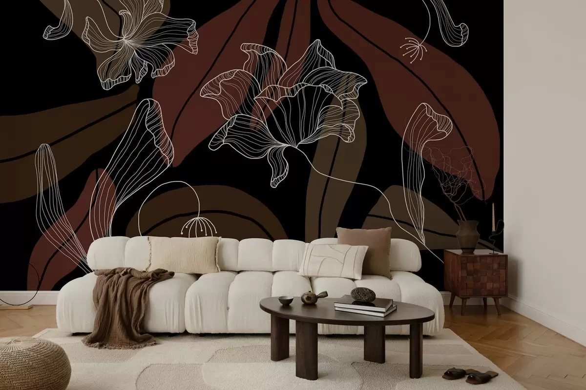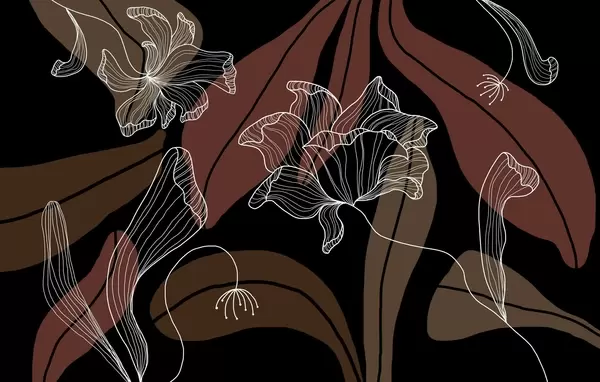 Fototapetes abstrakta lapu un ziedu kompozīcija smalkos un smilškrāsas toņos uz tumša fona Nr. w04499v3