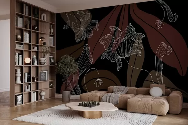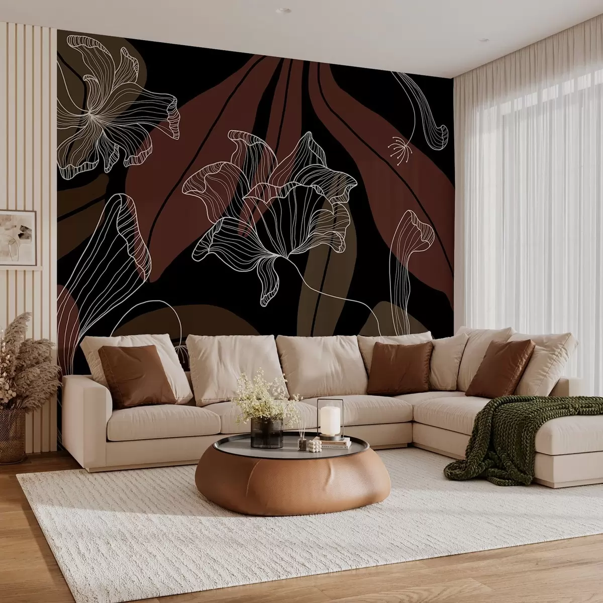 Fototapetes abstrakta lapu un ziedu kompozīcija smalkos un smilškrāsas toņos uz tumša fona Nr. w04499v3