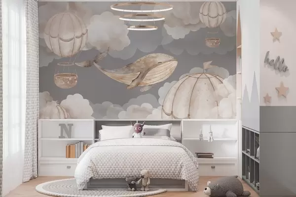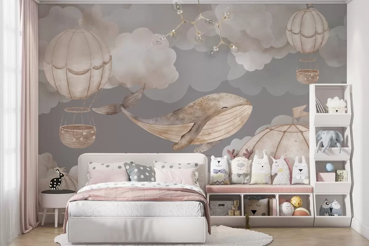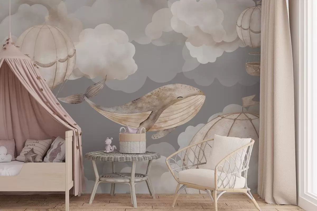 Fototapetes Vaļi un karstā gaisa baloni starp maigajiem mākoņiem Nr. w04522