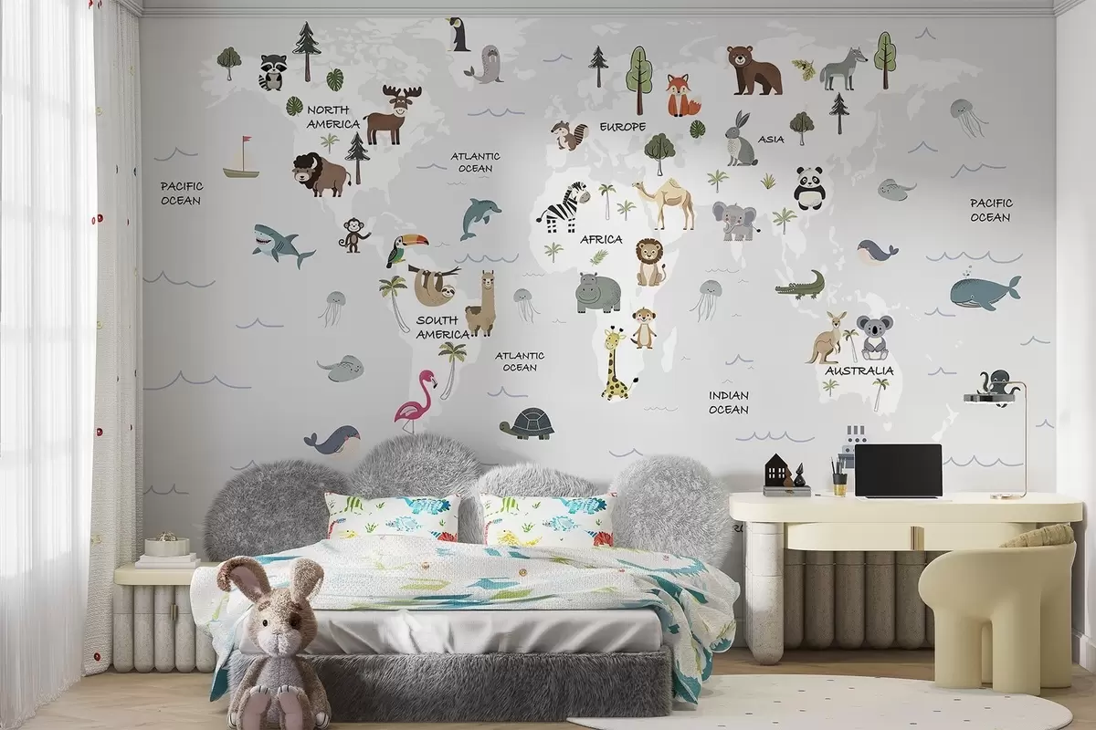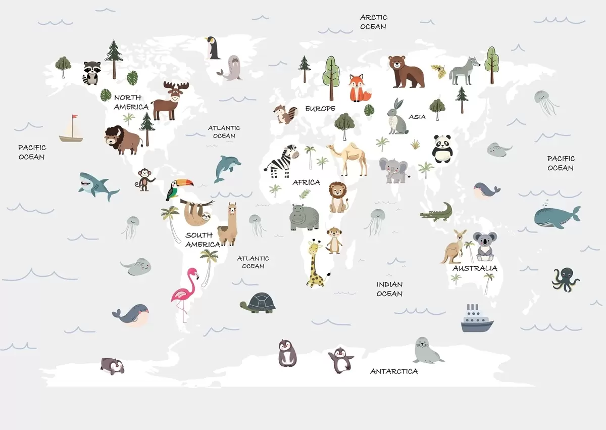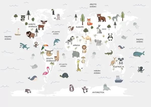 Fototapetes Pasaules karte ar dzīvniekiem Nr. w04663