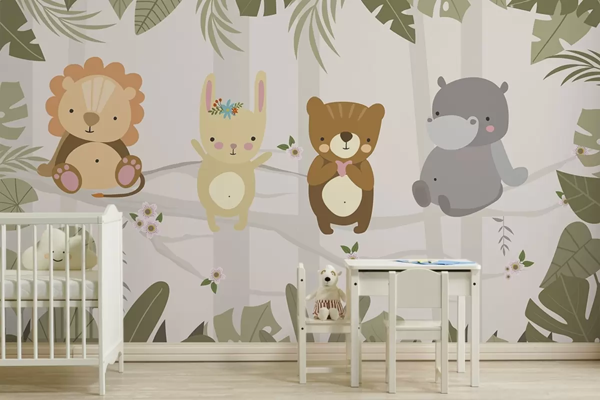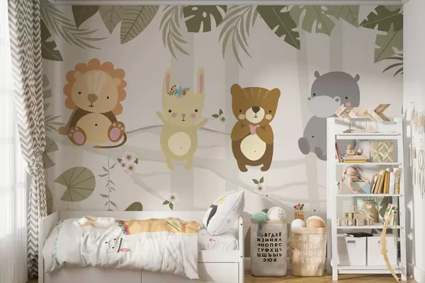 Fototapetes Cute lauva, zaķis, lācis un nīlzirgs starp lapām Nr. w04682