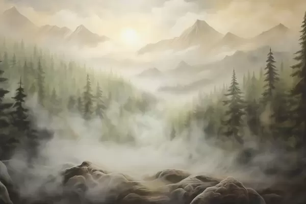 Fototapetes Mežs miglā uz kalnu fona Nr. w04730