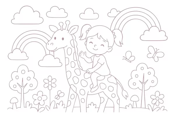 Fototapetes melnbaltā zīmējums, kurā attēlota meitene uz žirafes bērnu krāsojamās grāmatas stilā Nr. w04753