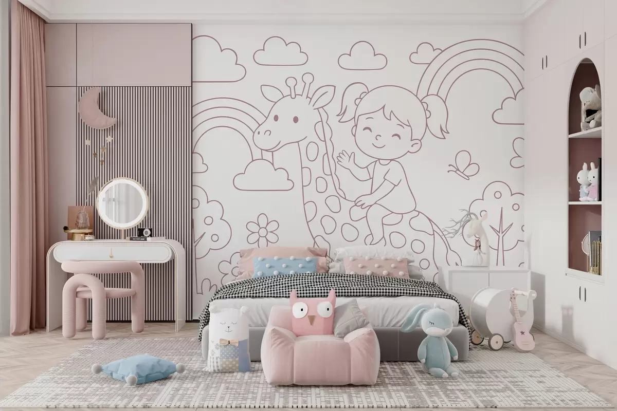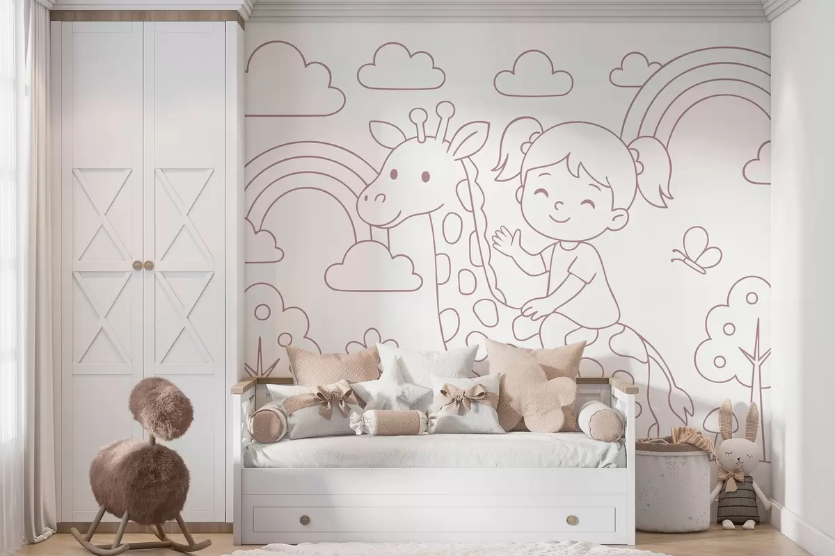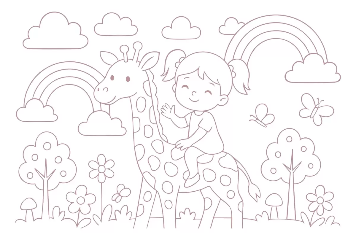 Fototapetes meitenes uz žirafes attēls pulverkrāsā bērnu krāsojamās grāmatas stilā Nr. w04753v1