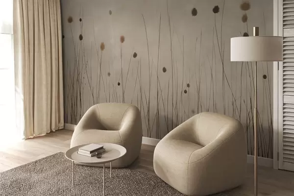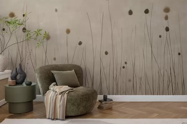 Fototapetes Plānas zāles un pūkainas sēklu galviņas uz siltā smilškrāsas fona Nr. w04793