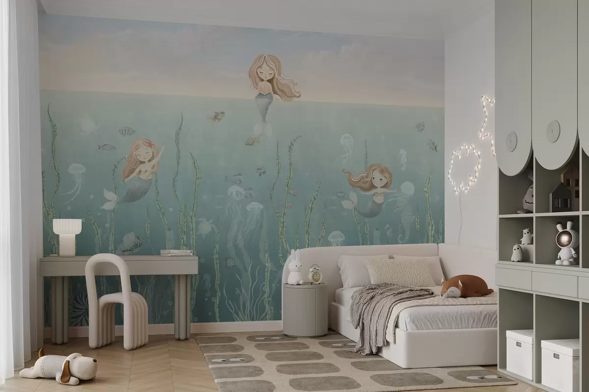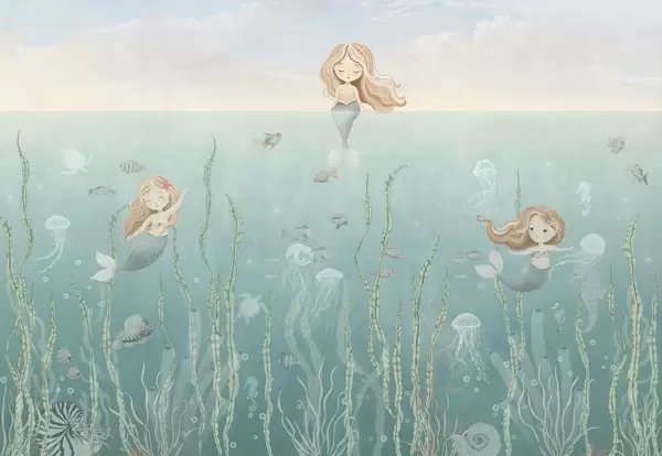 Fototapetes Rotaļīgas sirēnas zem ūdens ar aļģēm, medūzām un zivīm Nr. w04860