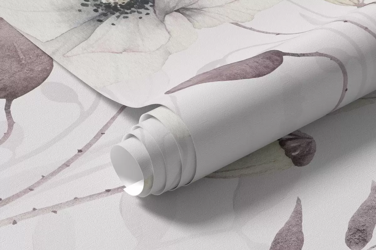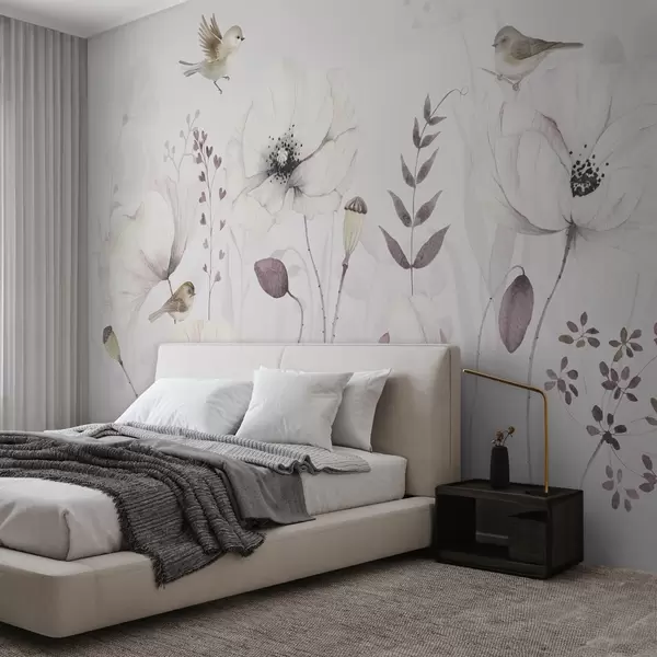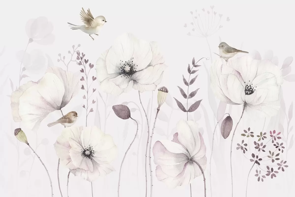 Fototapetes Akvareļa magones ar maziem putniņiem maigā violētā krāsā Nr. w04861