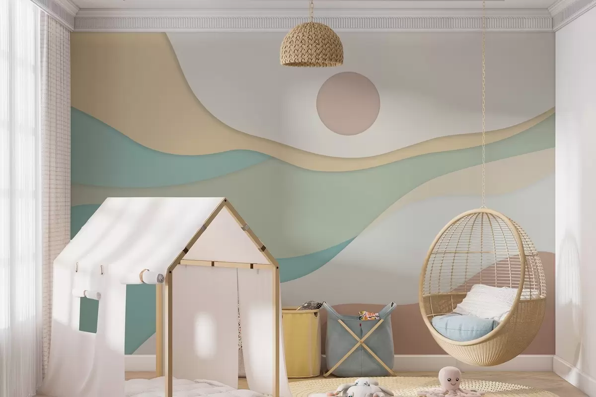 Fototapetes Minimālistiska abstrakcija ar maigām, viļņveidīgām formām, kas atgādina plūstošus ainavas un kāpas. Nr. w04874