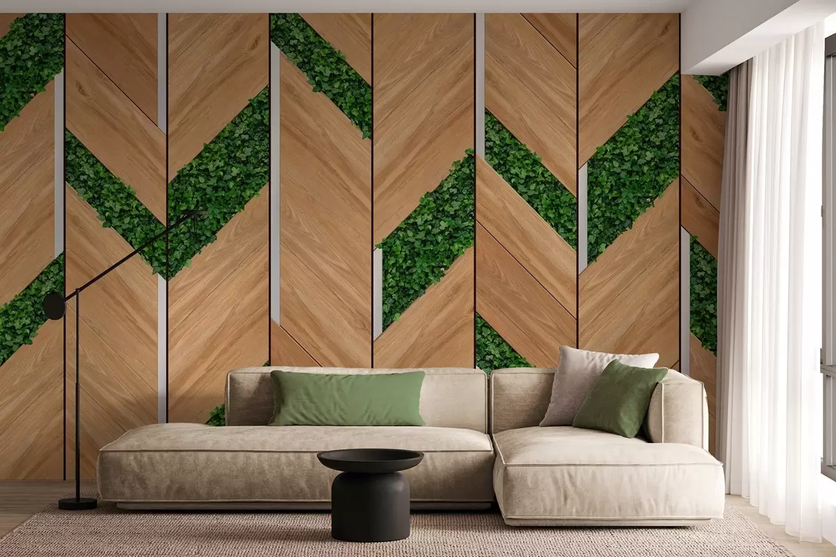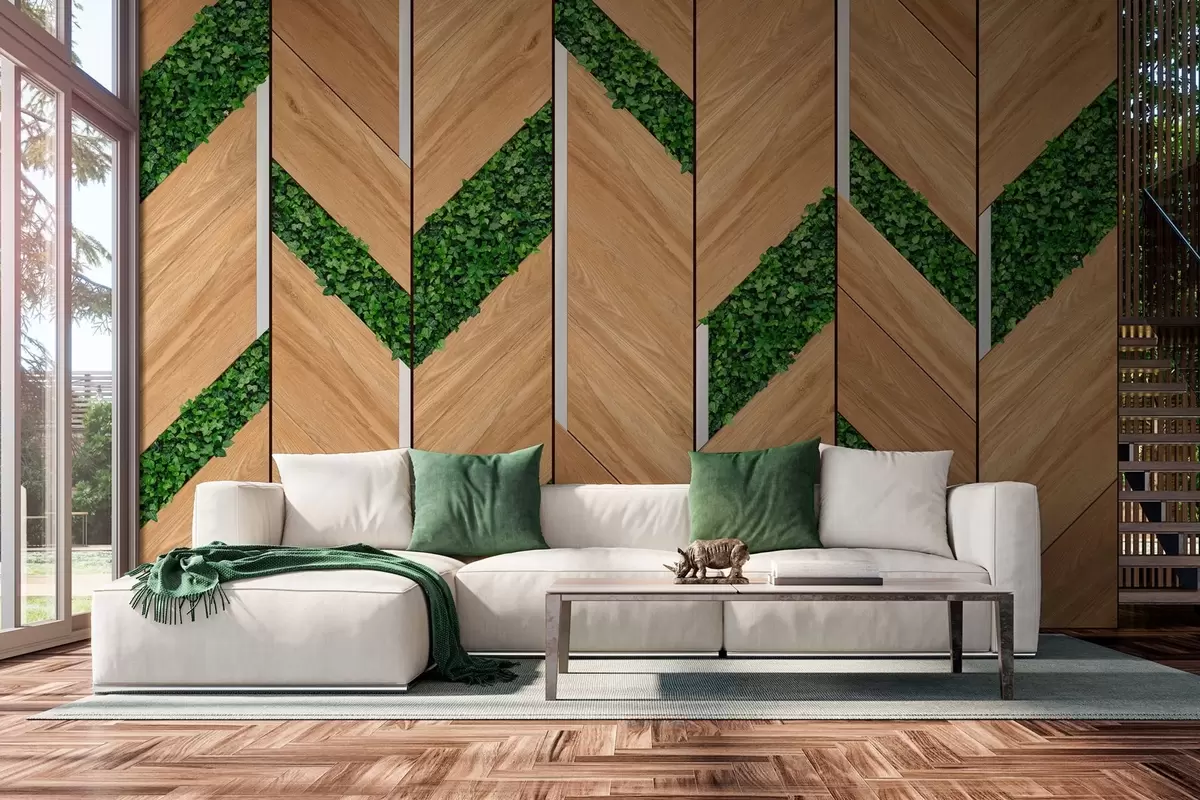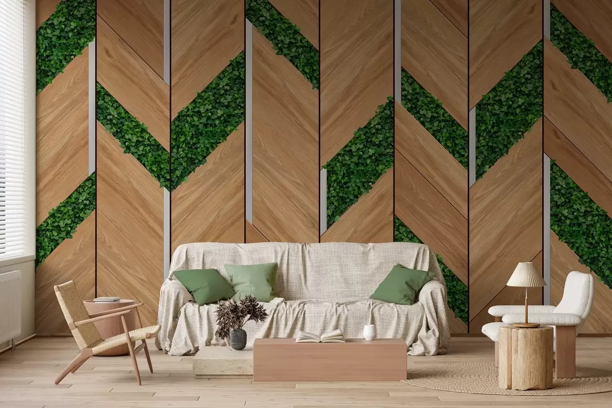 Fototapetes vieglās koka paneļu imitācija ar augu ieliktņiem Nr. w04875