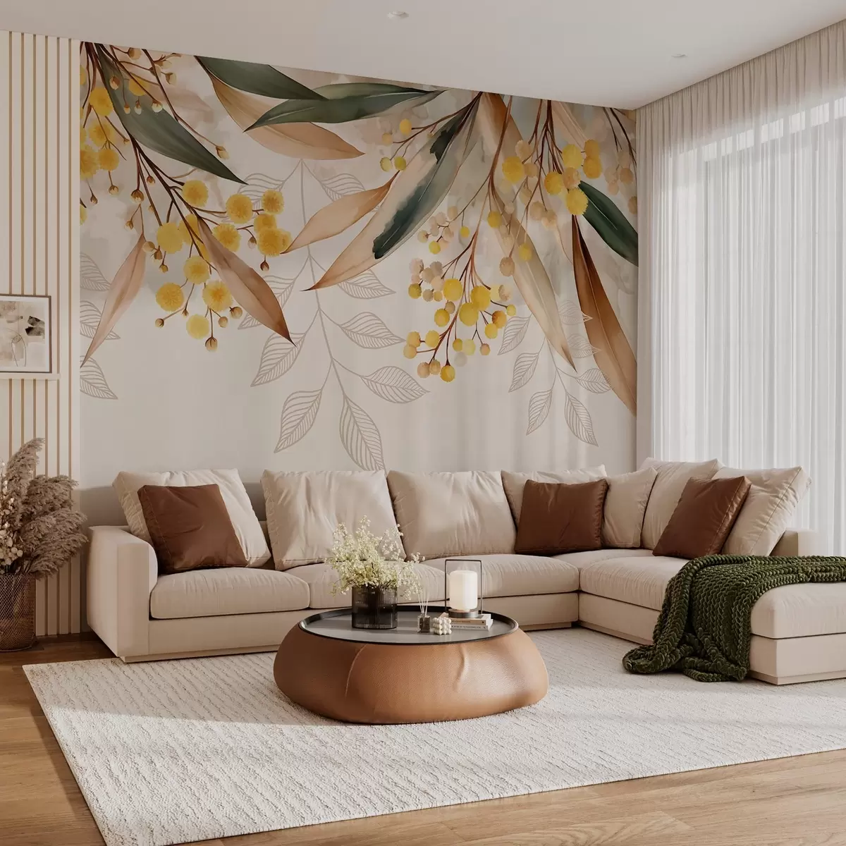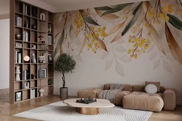 Fototapetes mimozas ziedi un lapas, kas krīt no augšas akvareļa stilā Nr. w04880