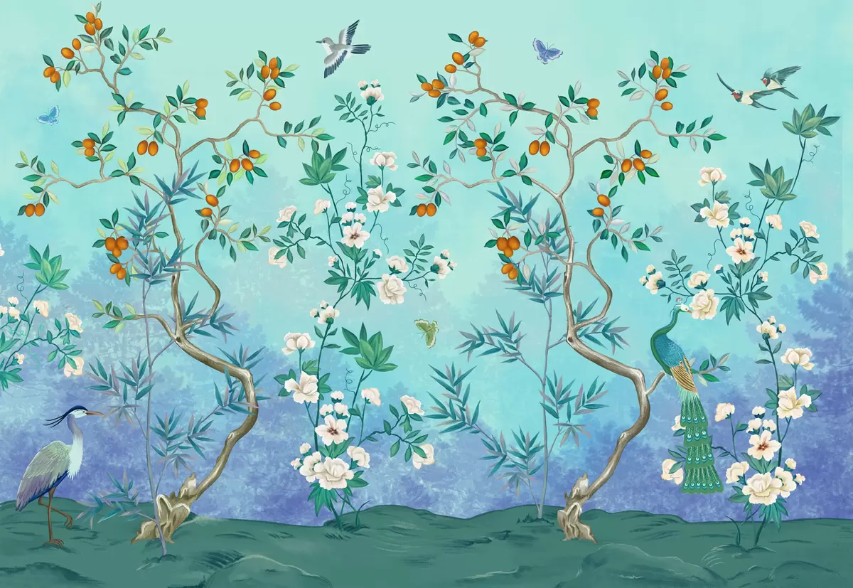 Fototapetes Aina ar kokiem, ziediem un putniem, zils fons Nr. w05004v2