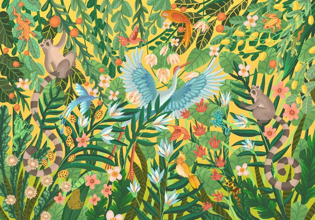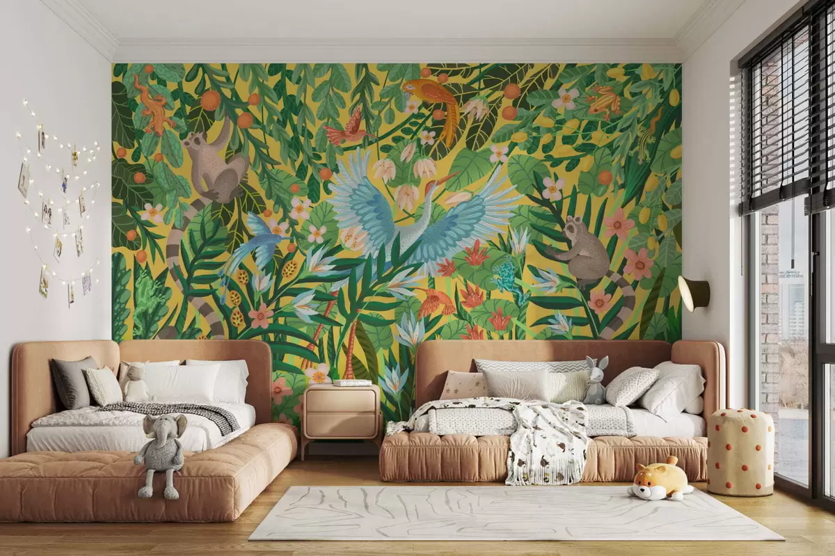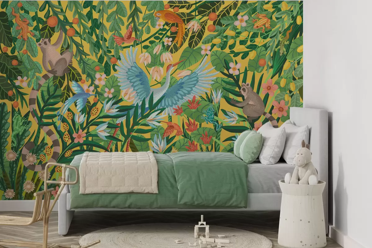 Fototapetes Spilgta aina ar putniem un dzīvniekiem blīvā zaļumā Nr. w05024v1