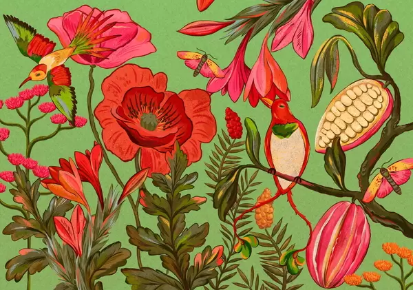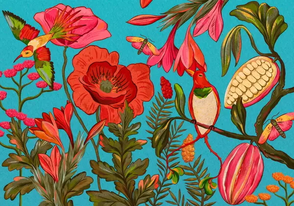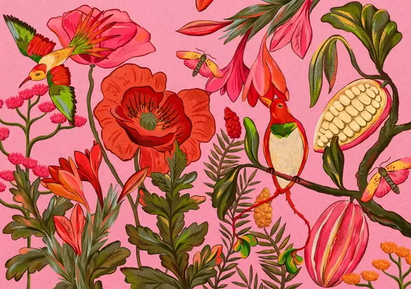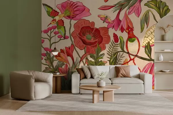 Fototapetes Dekoratīvi ziedi un putni uz smilškrāsas fona Nr. w05036