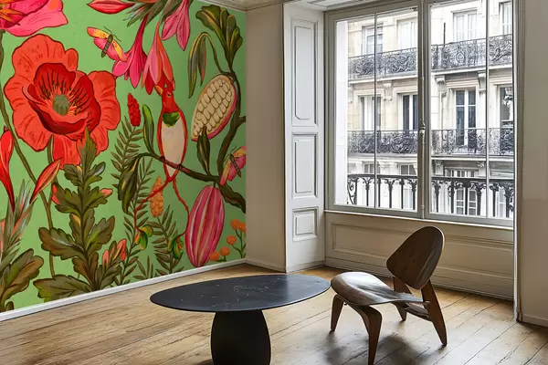 Fototapetes Dekoratīvi ziedi un putni uz zaļa fona Nr. w05036v1