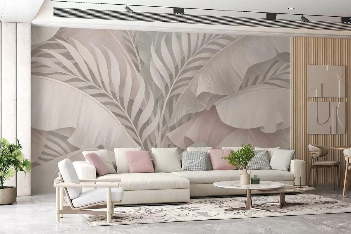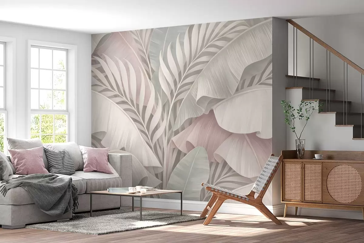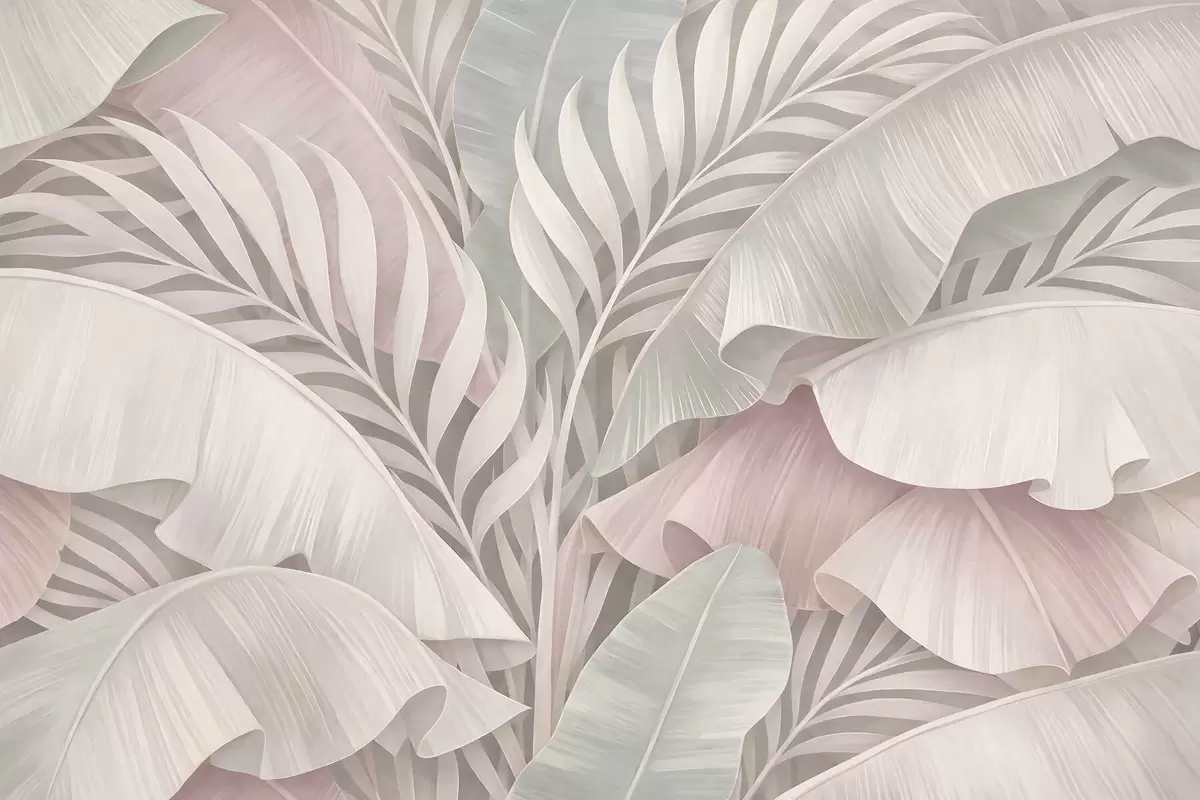 Fototapetes lieli tropu lapas vēsās rozā un pelēkās toņos Nr. w05062v1