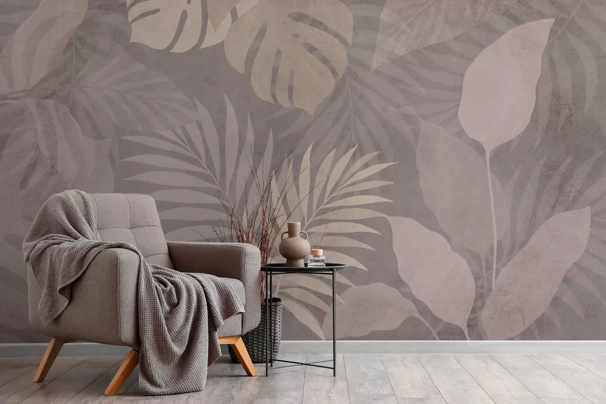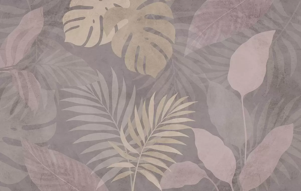 Fototapetes teksturētas tropu lapas uz pelēka fona Nr. w05063v1