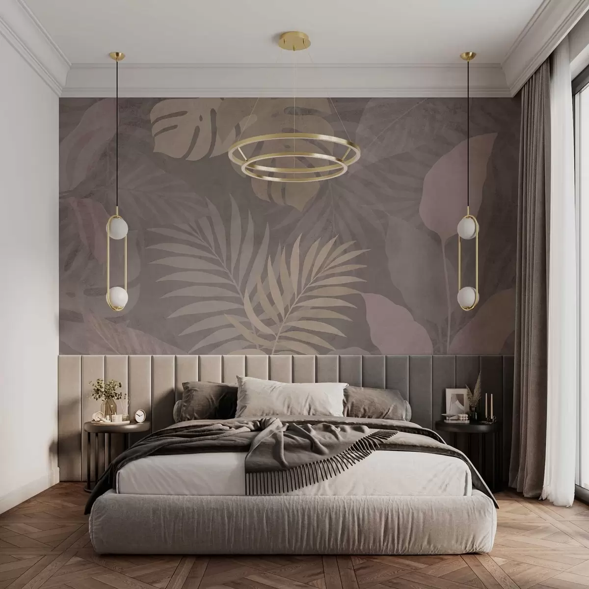 Fototapetes teksturētas tropu lapas uz pelēka fona Nr. w05063v1