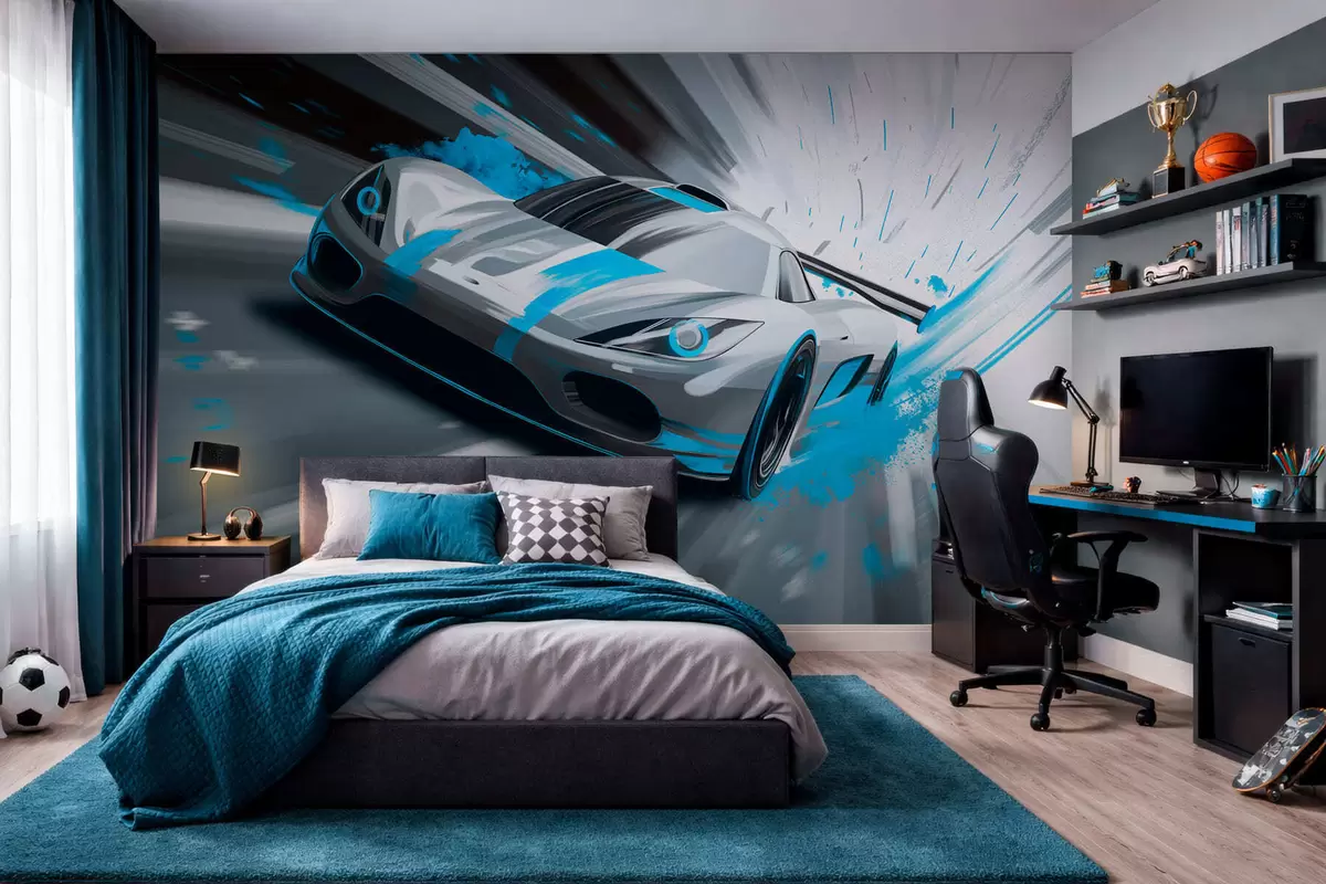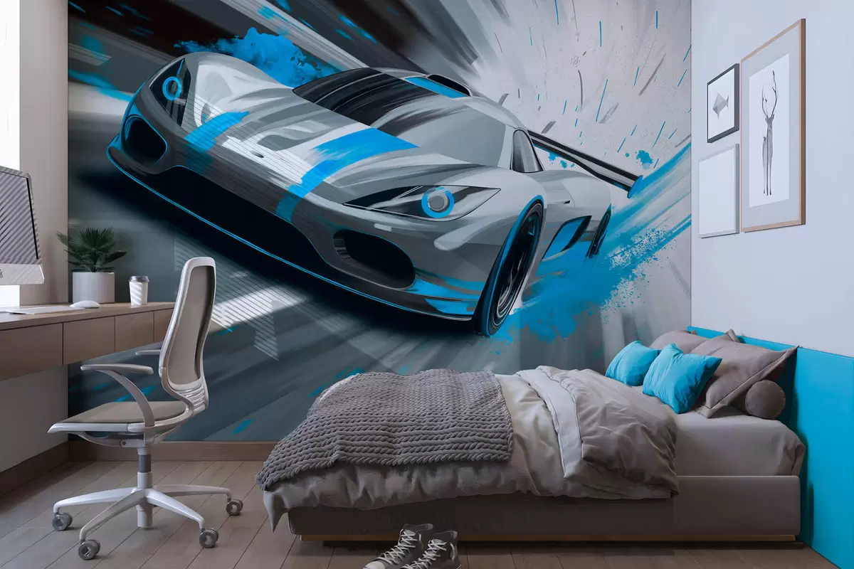 Fototapetes dinamisks sporta auto digitālā zīmējuma stilā ar tirkīza akcentiem Nr. w05069v3