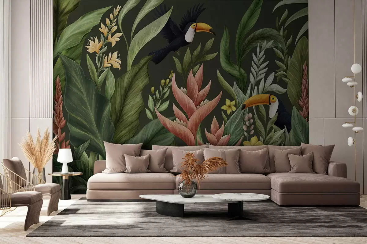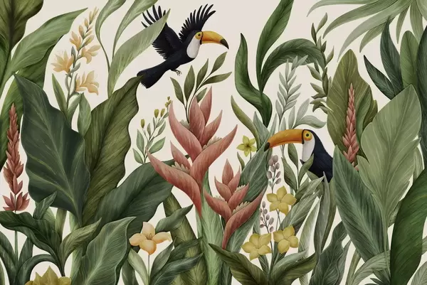 Fototapetes Tropu augi un liela knābja putni uz gaiša fona Nr. w05088