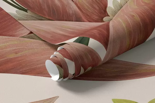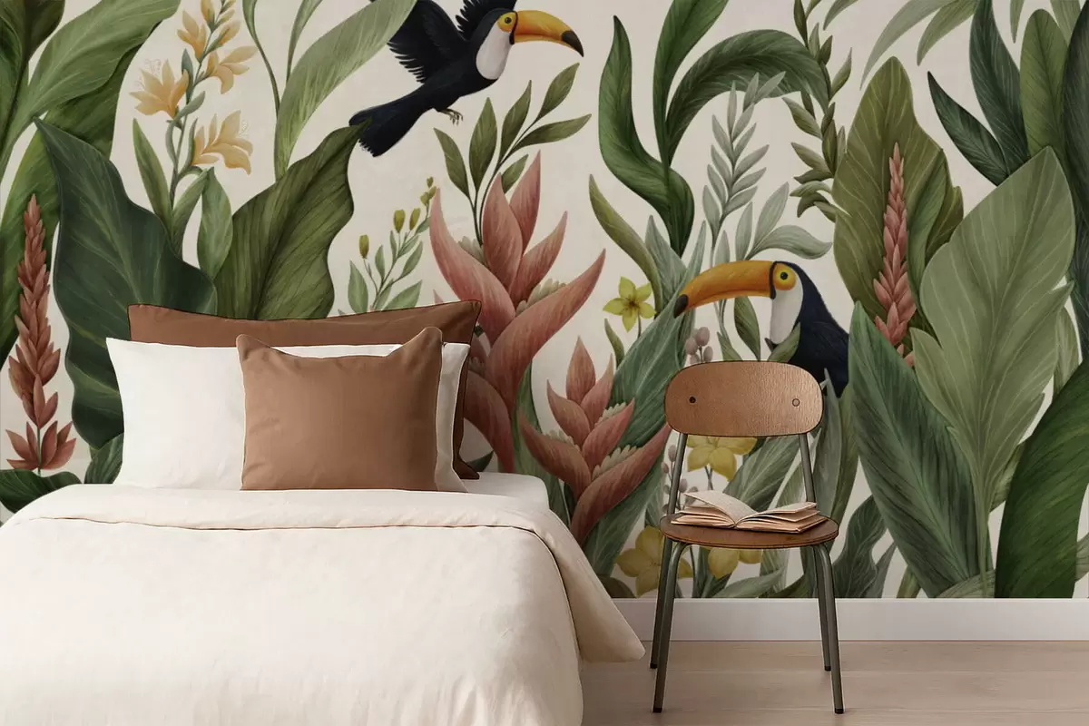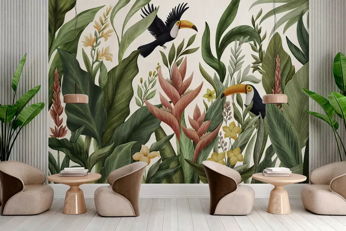 Fototapetes Tropu augi un liela knābja putni uz gaiša fona Nr. w05088v1