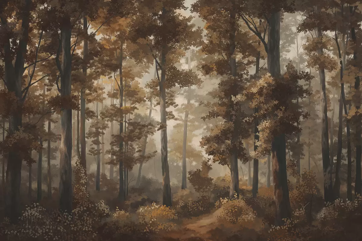 Fototapetes Rudens meža ainava ar siltu gaismu un blīviem kokiem Nr. w05089v1
