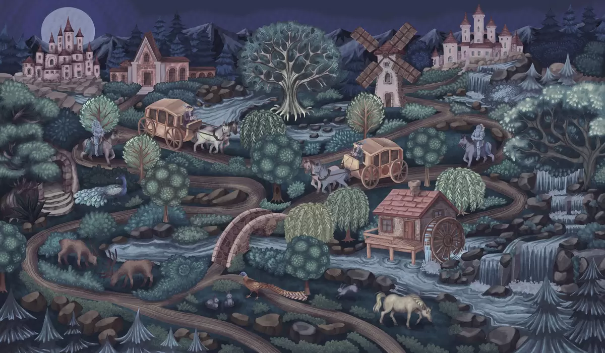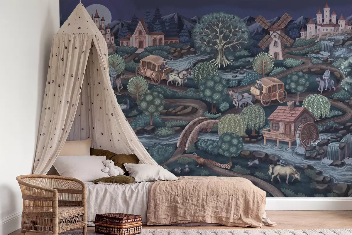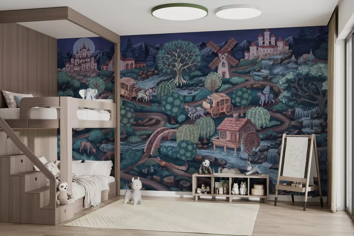 Fototapetes Nakts pasaku aina ar pilīm, dzirnavām un mežu Nr. w05091