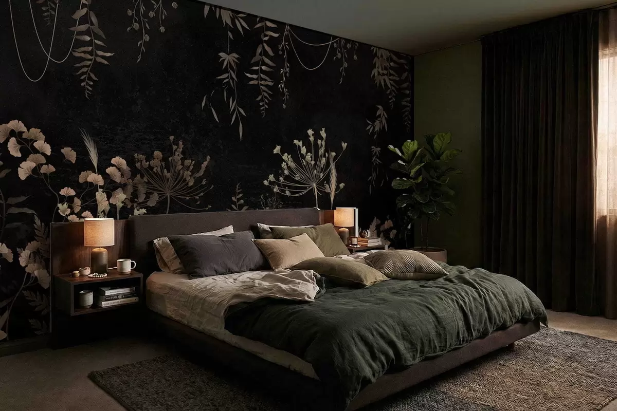 Fototapetes Tumšs botānisks raksts ar ziediem un lapām Nr. w05092