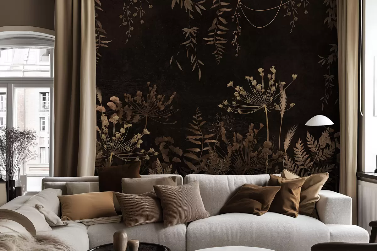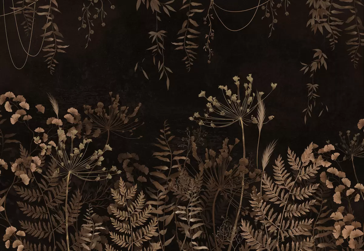 Fototapetes Tumšs botānisks raksts ar ziediem un zāli Nr. w05092v3