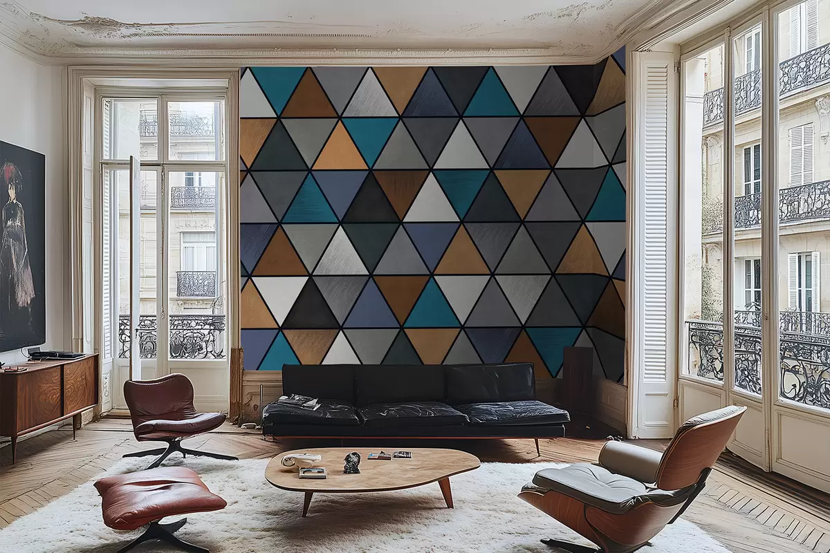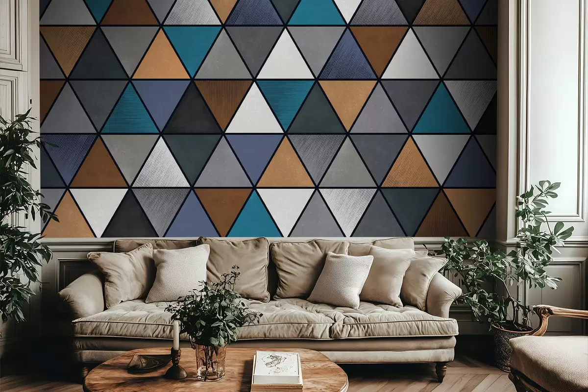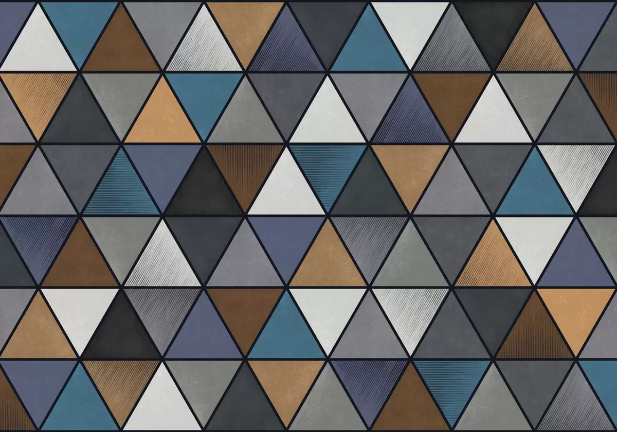 Fototapetes Trijstūra formas ģeometrisks raksts zilā un siltos toņos Nr. w05095