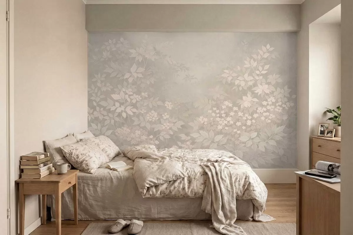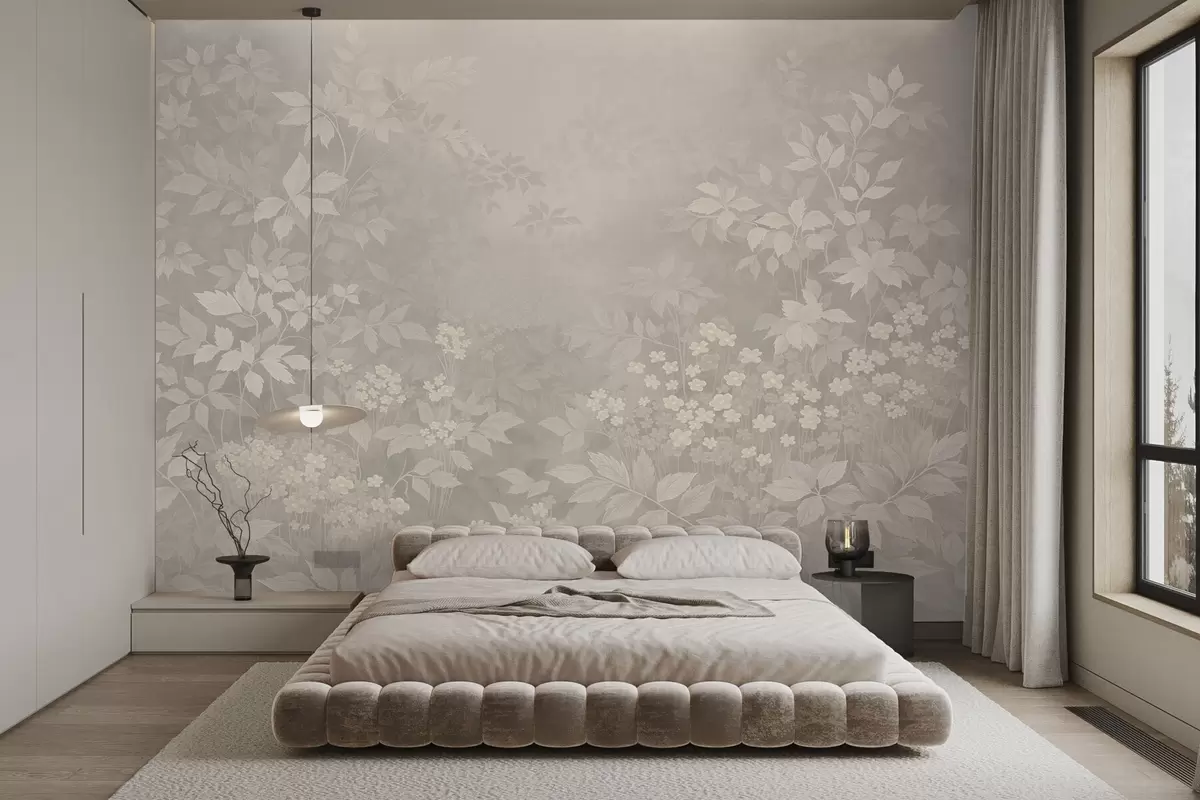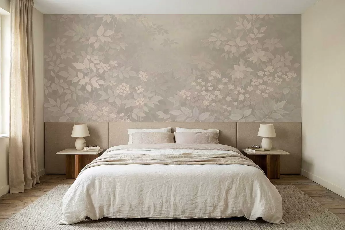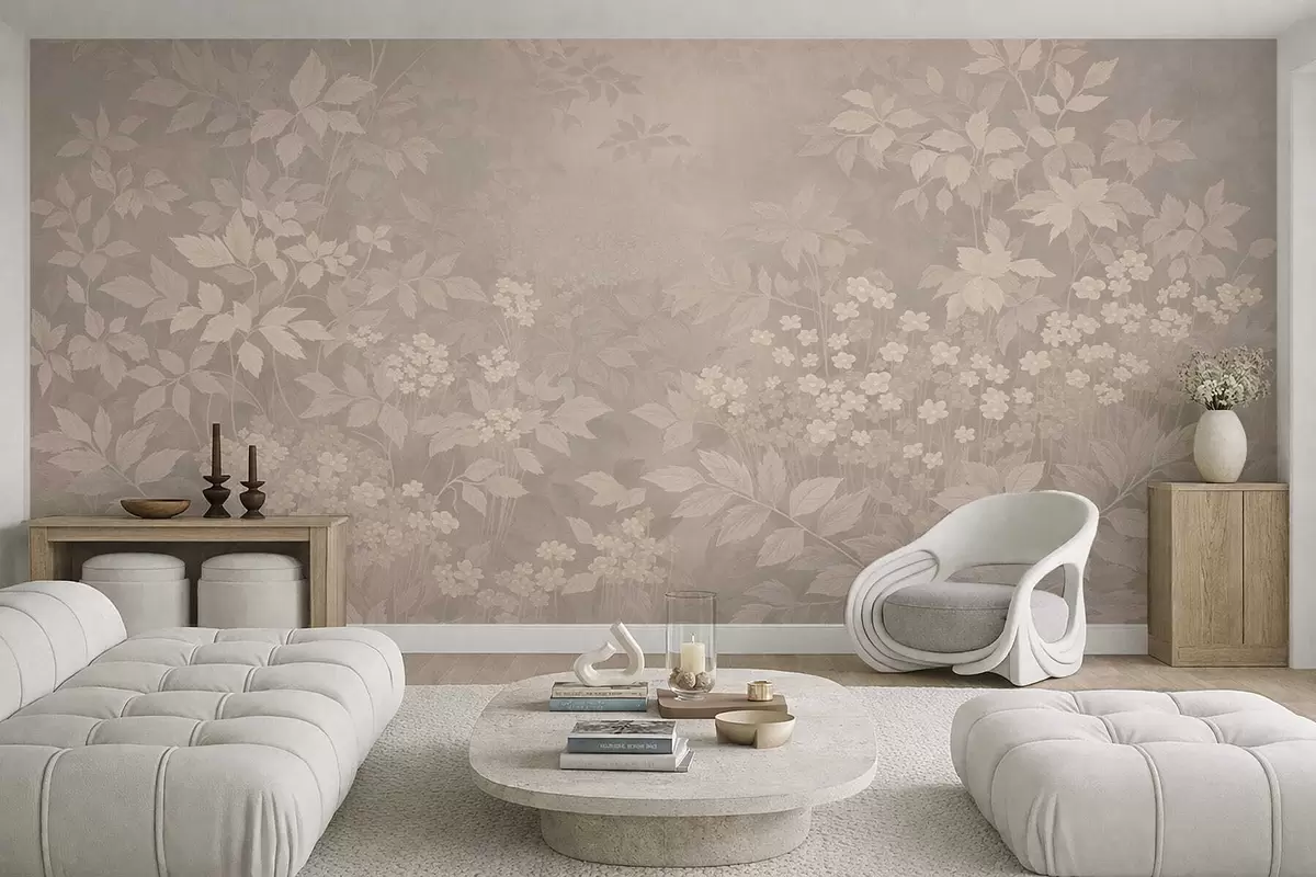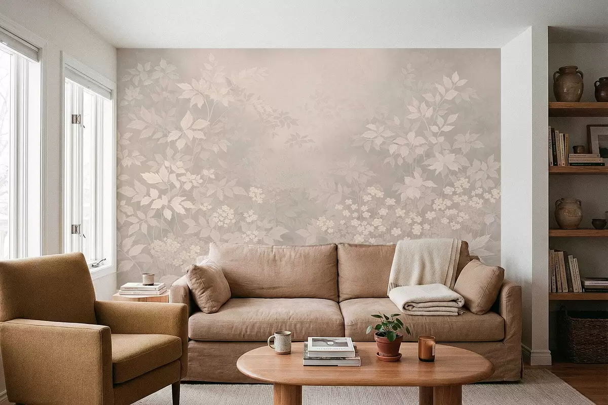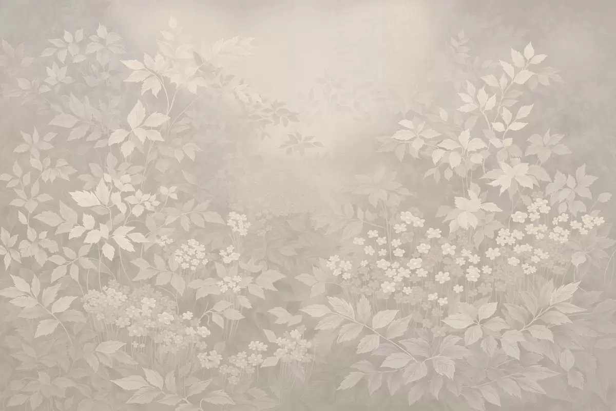 Fototapetes Maigs botānisks raksts ar lapām un ziediem miglā Nr. w05115v1