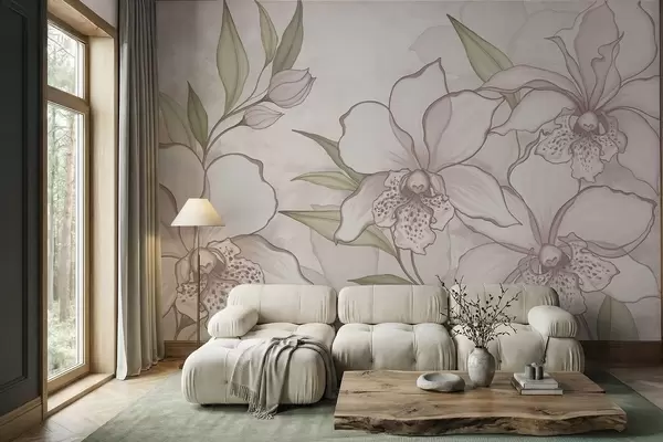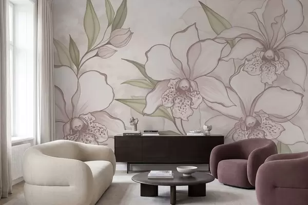 Fototapetes Ilustrācija ar gaišām orhidejām ar lapām uz smilškrāsas fona Nr. w05117