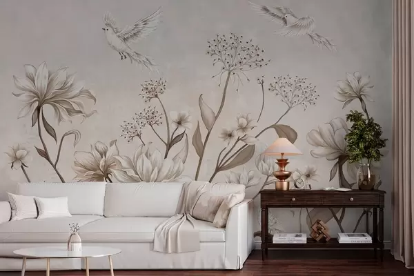 Fototapetes Gaiši ziedi un putni uz maiga fona Nr. w05118